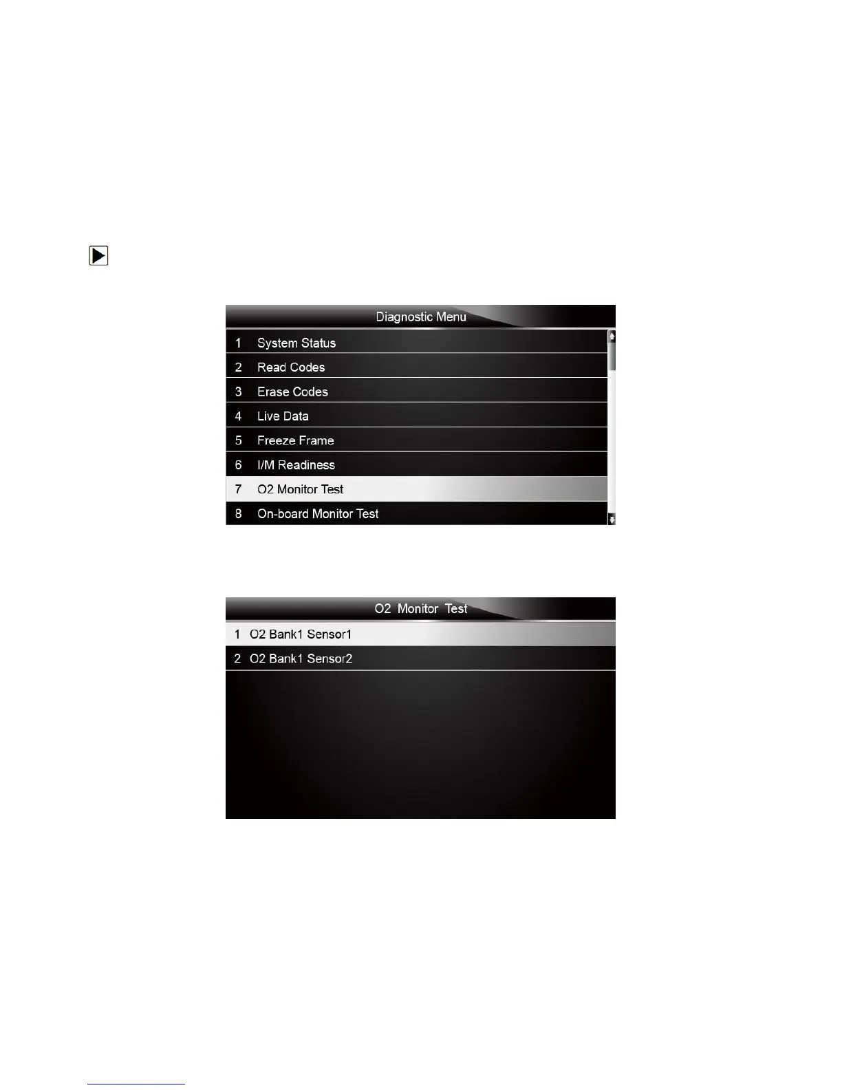 1. Scroll with the arrow keys to highlight O2 Monitor Test from Diagnostic Menu and press the