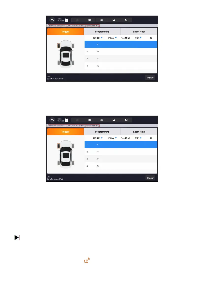 The sensor trigger function allows activating of TPMS sensor to view sensor
