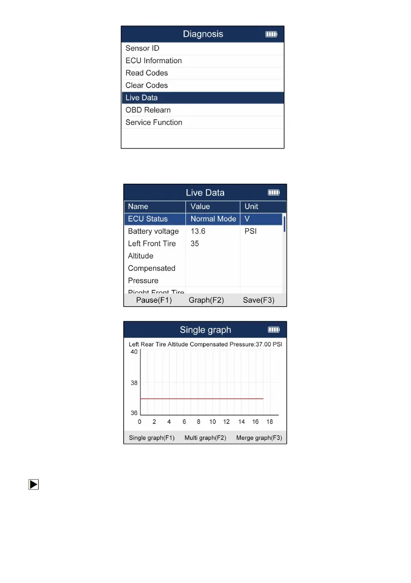 3.The live data will be displayed. Press F1 button to Pause, F2 button to enter graph screen, F3