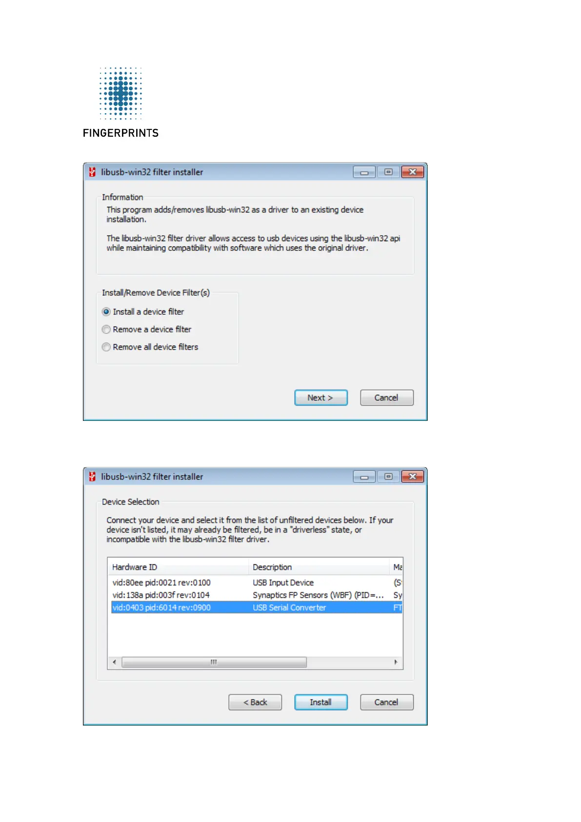 Converter” and the manufacturer “FTDI”. Select that device and press “Install”.