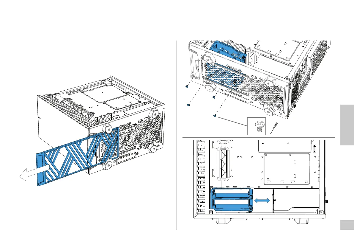 Laufwerkskä󰘰g umsetzen / Positionner une cage de disque dur / Recoloque una caja de disco duro / Flytta hårddiskburen / Перенесите отсек дискового накопителя / ハードドライブケージの取り