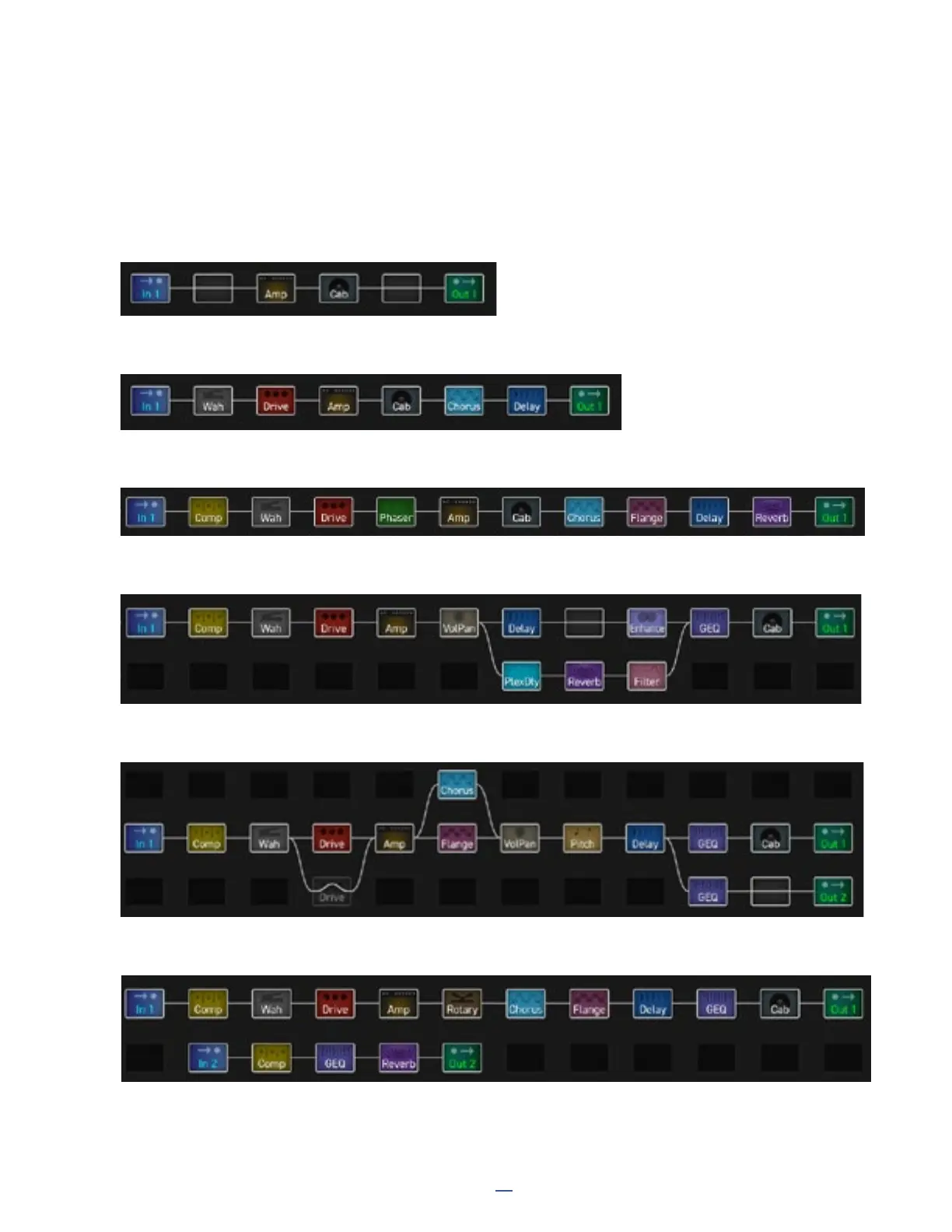 Ex 5: A complex preset with some effects in parallel, plus separate outputs with and without cab simulation.