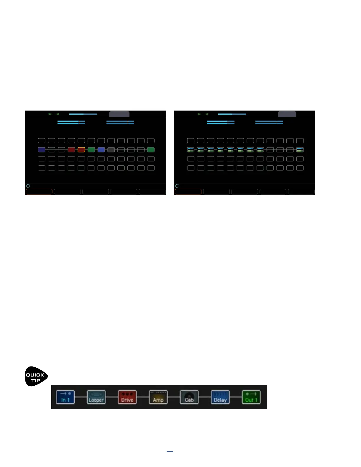 To set levels, play your guitar and watch the VU meters. Adjust the output level of the Amp block by selecting it on