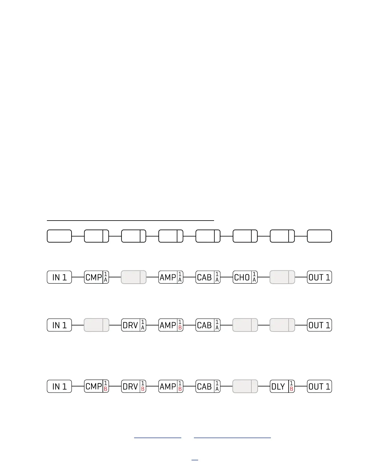 parameters for the entire block. For example, Channel A of a Drive block might be dialed in as a clean boost, B as