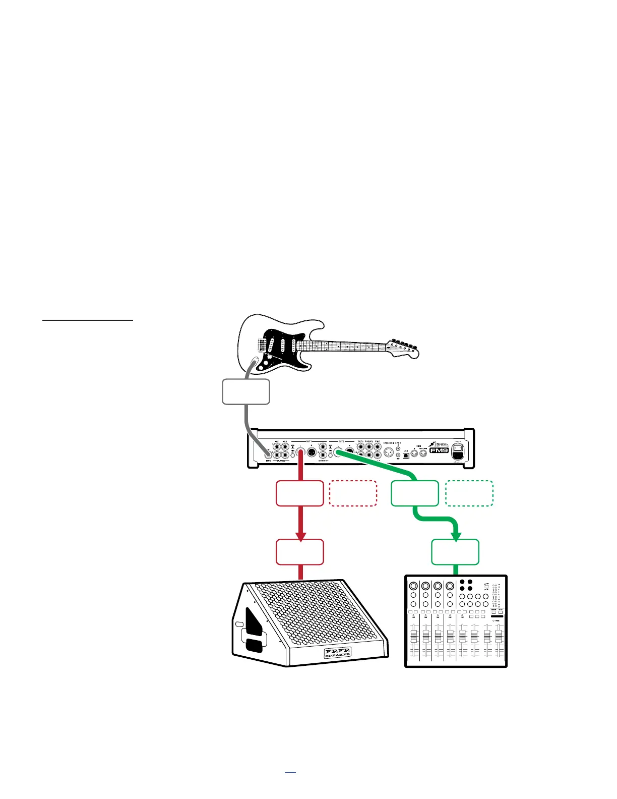 This setup sends identical signals to the front-of-house PA and your personal FRFR monitor, with separate level