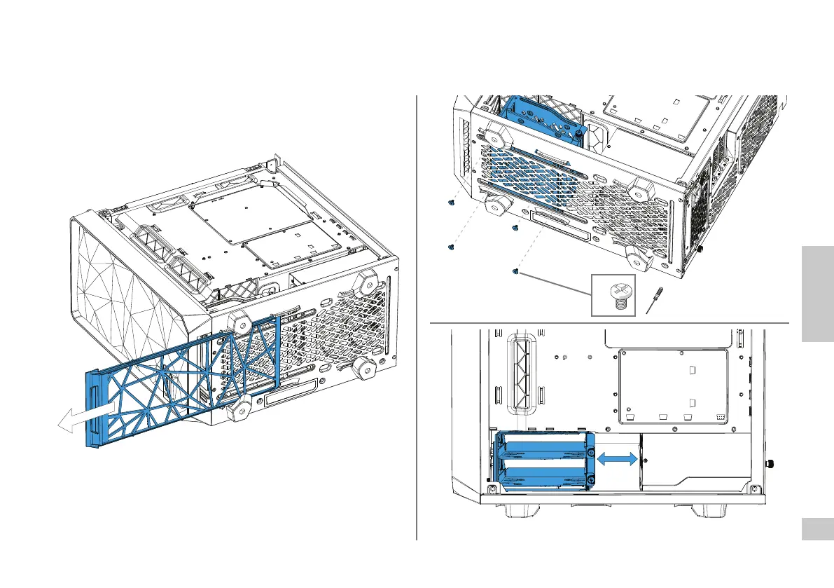 Laufwerkskä󰘰g umsetzen / Positionner une cage de disque dur / Recoloque una caja de disco duro / Flytta hårddiskburen / Перенесите отсек дискового накопителя / ハードドライブケージの取り