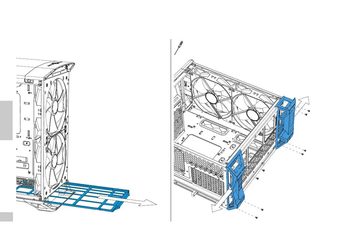 Ausbau der Gehäuse-Füße für eine leichtere Installation der Lüfter / Retirez les pieds du boîtier pour faciliter l’installation du ventilateur / Retire los pies de la torre para instalar el ventilador /