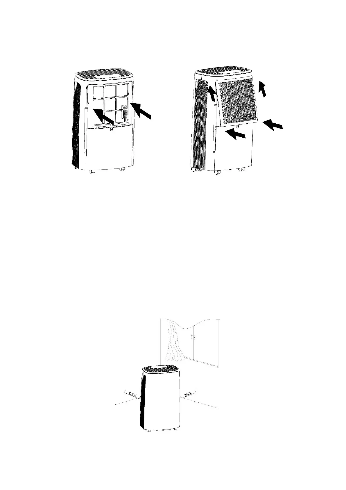 Mantenete il margine minimo intorno al deumidificatore quando l'unità funziona come mostrato nel