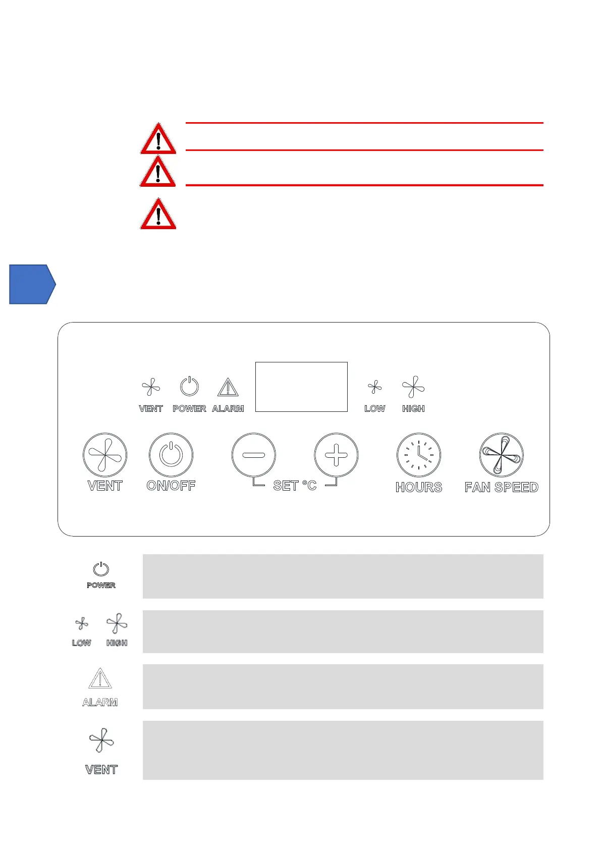 LED ALARM: Wenn diese LED leuchtet, zeigt sie das Vorhandensein eines Alarms an. Auf dem Display wird