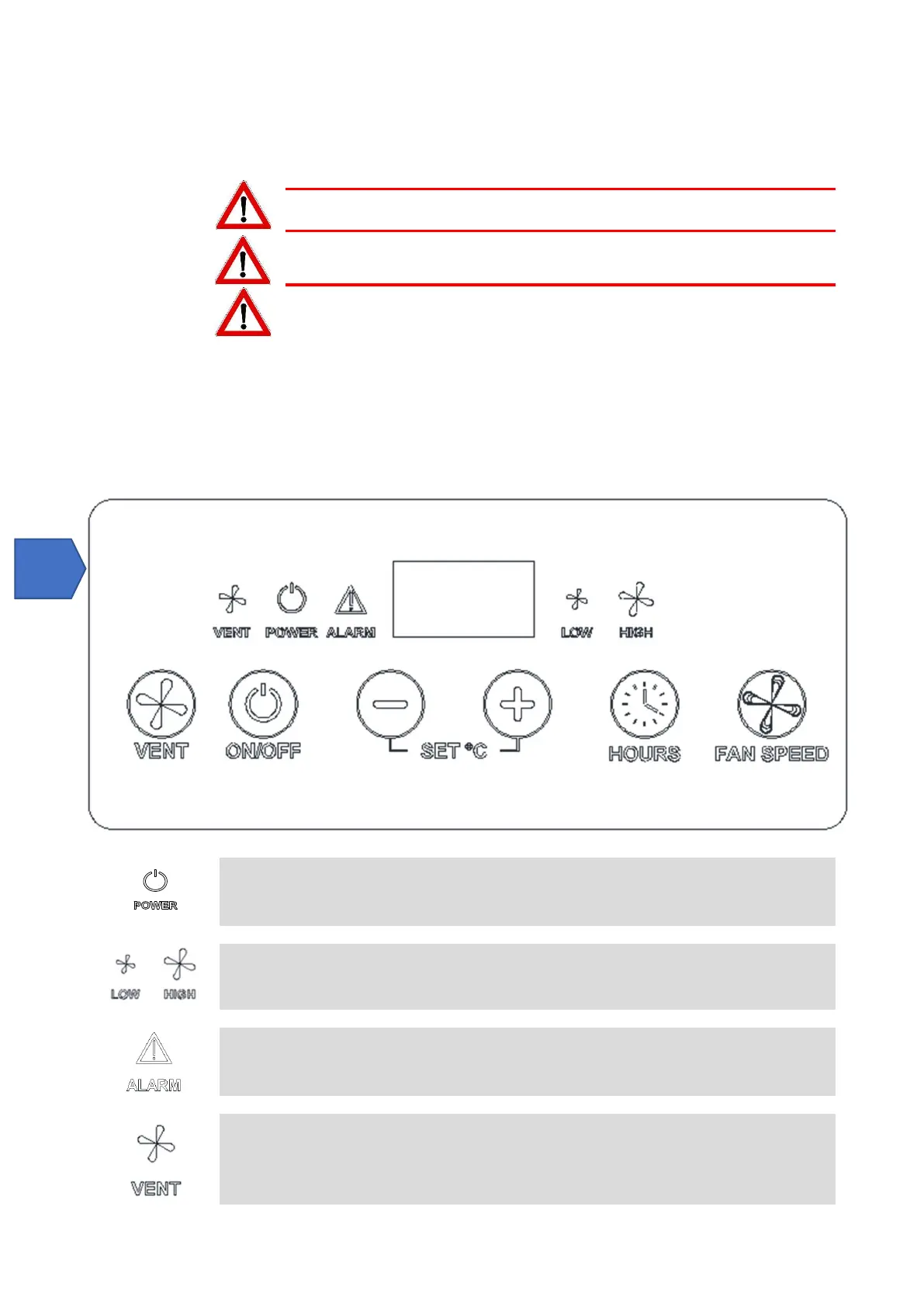 LED VENT : Cette DEL, lorsqu'elle est allumée, indique que l'appareil fonctionne uniquement en ventilation.