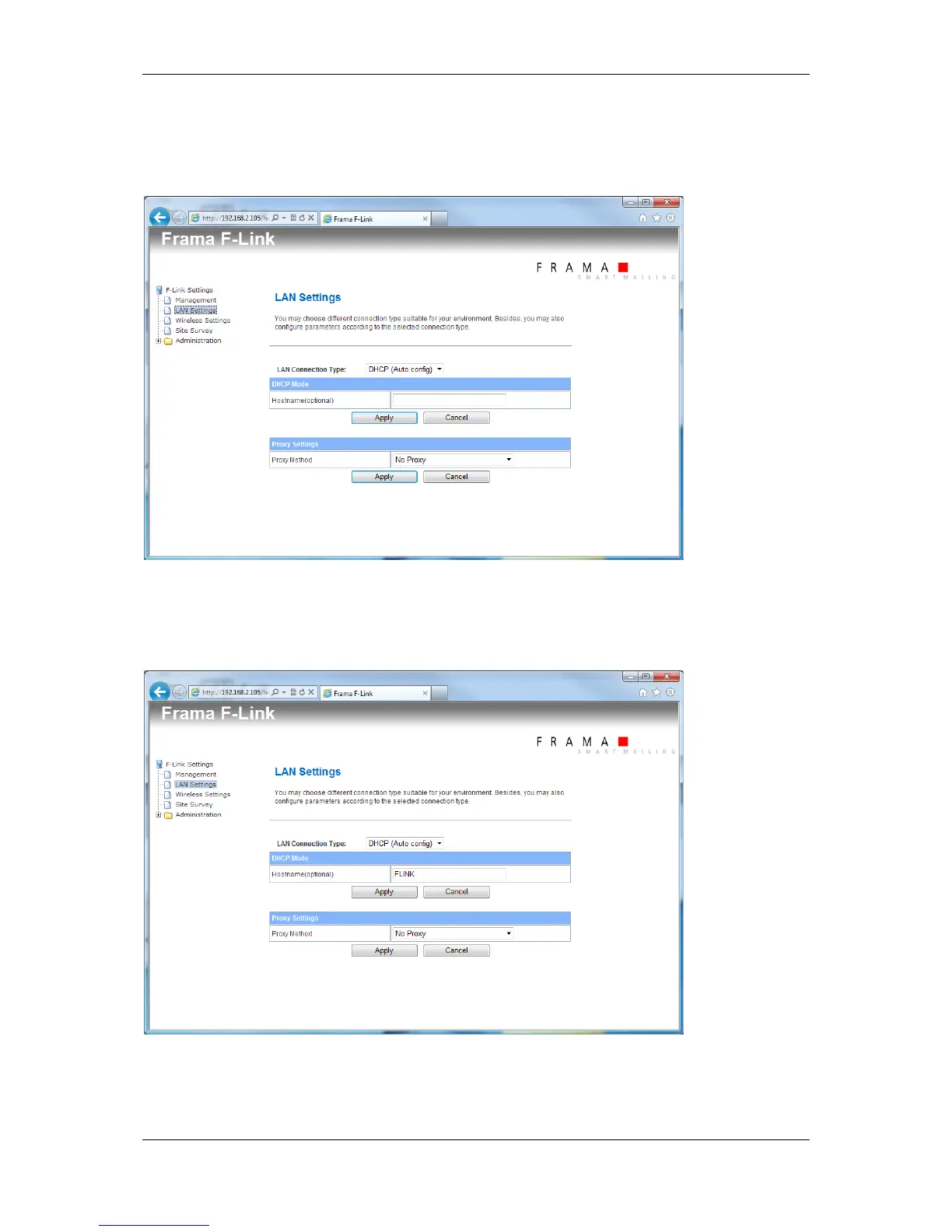 LAN connection type and set the proxy settings for F-Link.