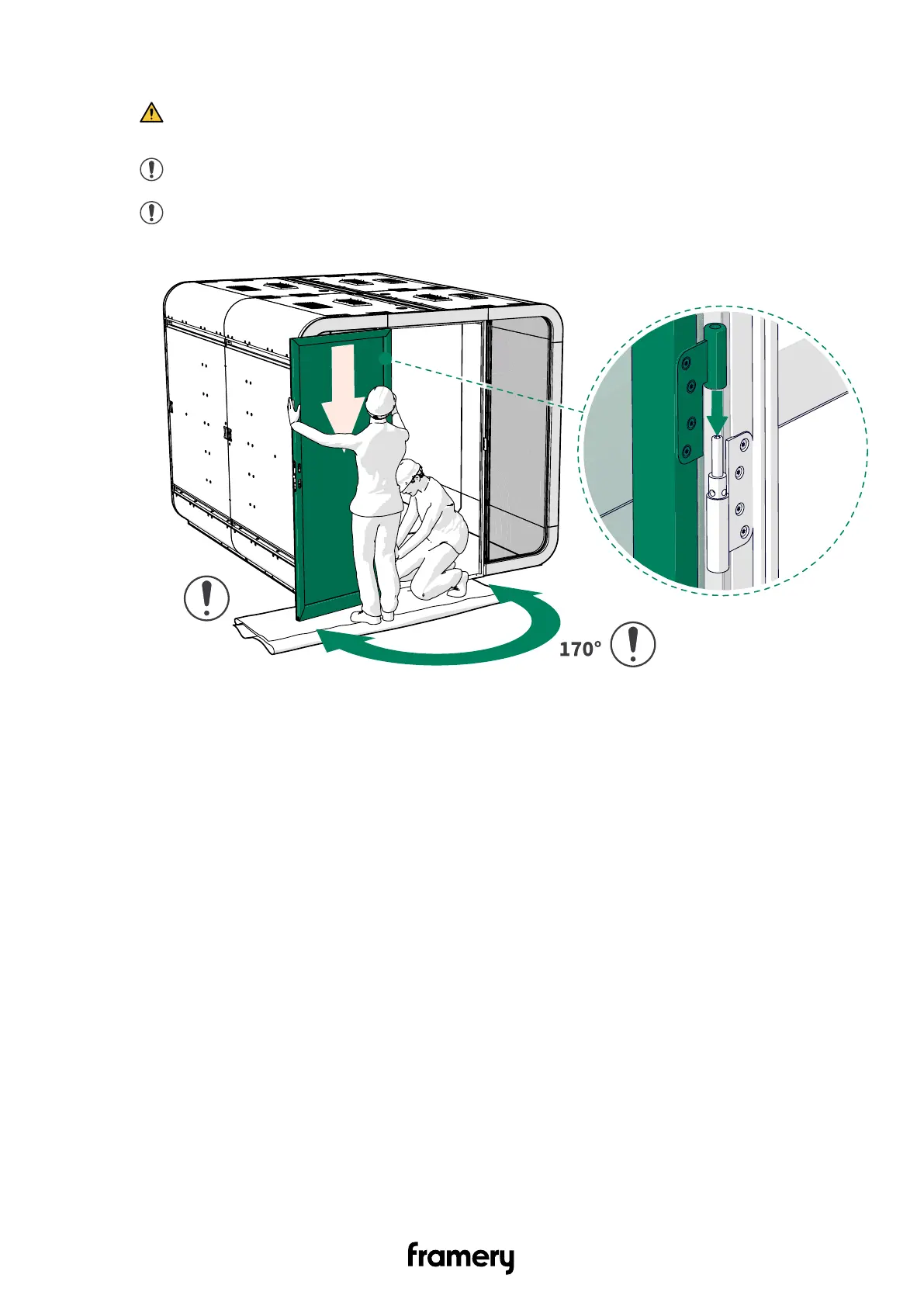 Warning: Lifting requires two people. Make sure that the lower hinge falls into