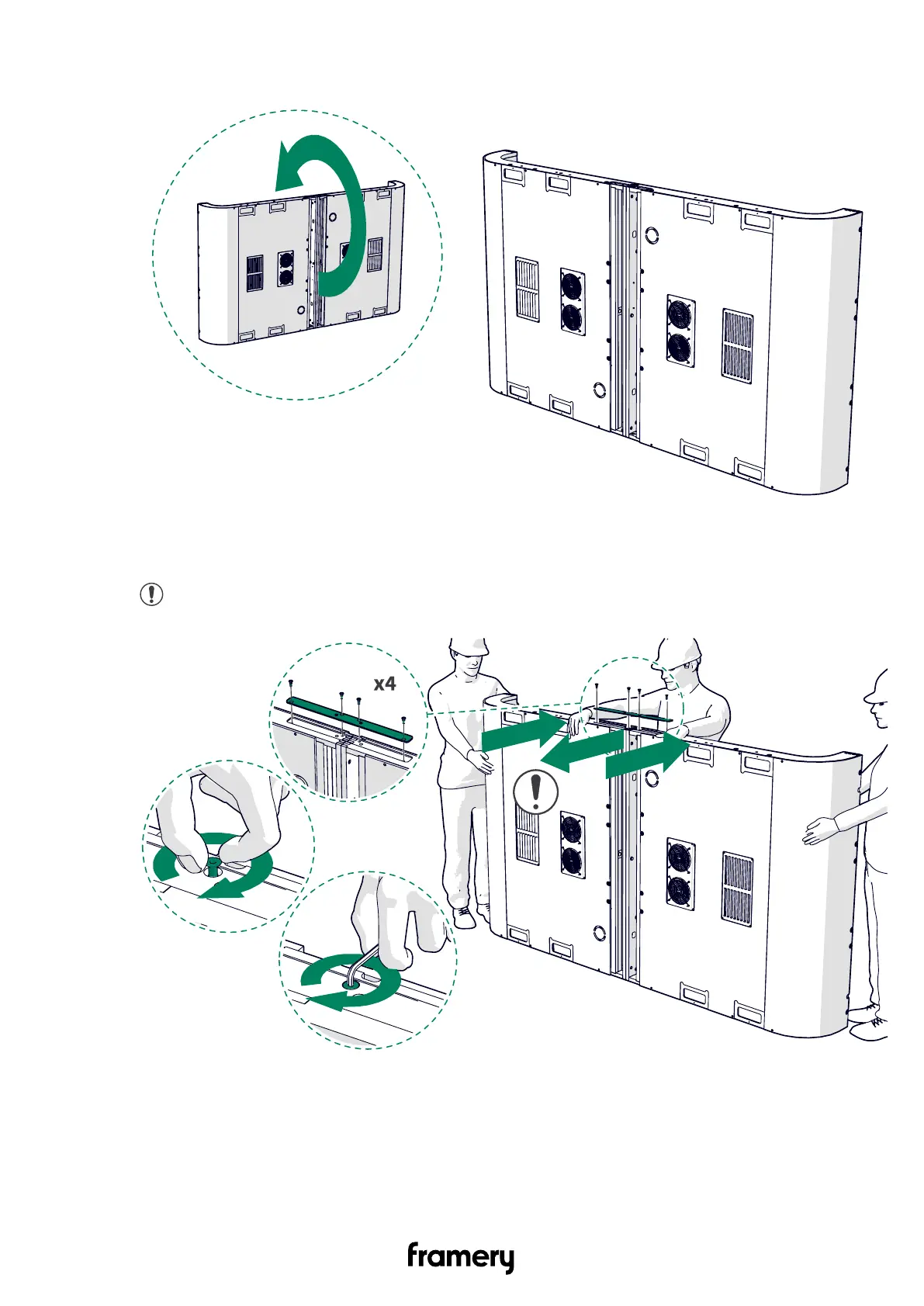 Note: Pull the roof modules straight to fit the support plate into place. Bend the
