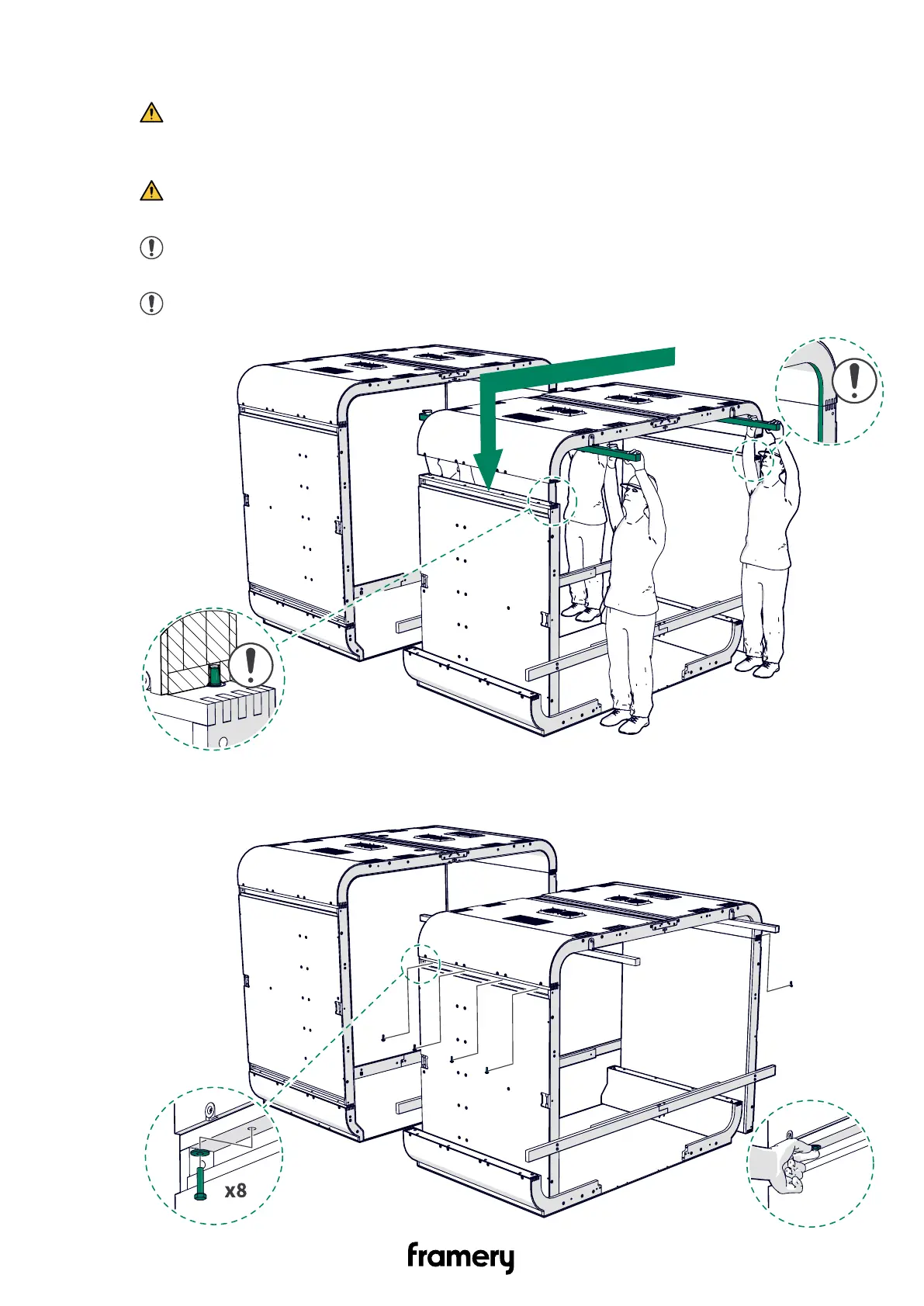 Lifting requires four people. Do not go under the roof until the fixing bolts are