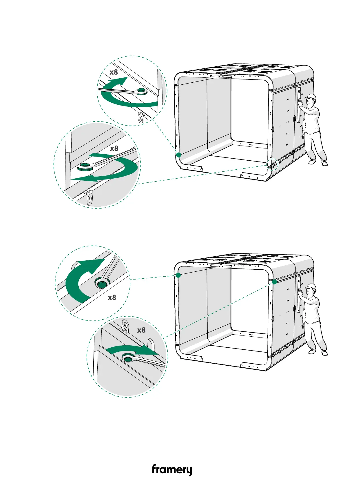 9. Tighten the bolts (8 pcs per side) on the roof and wall module junction of the back and