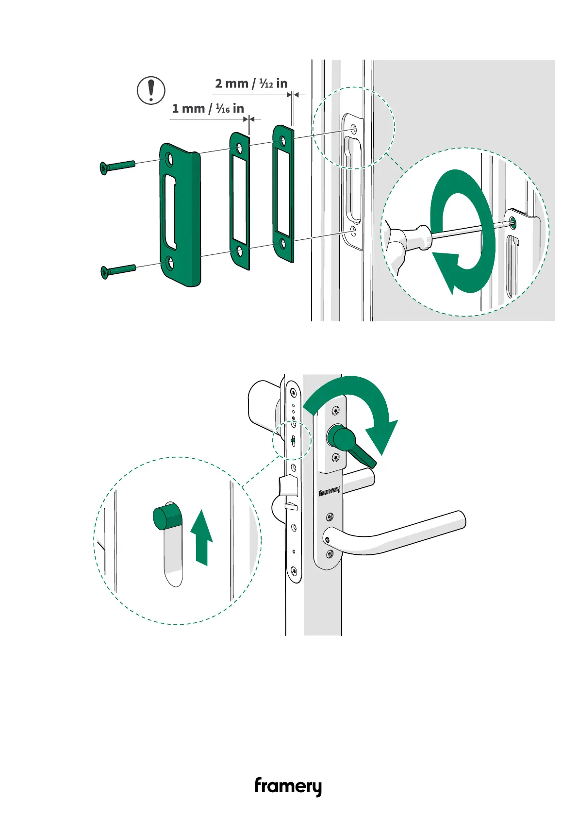 1. With the door open, press the thumb turn down and push the sliding snib up.