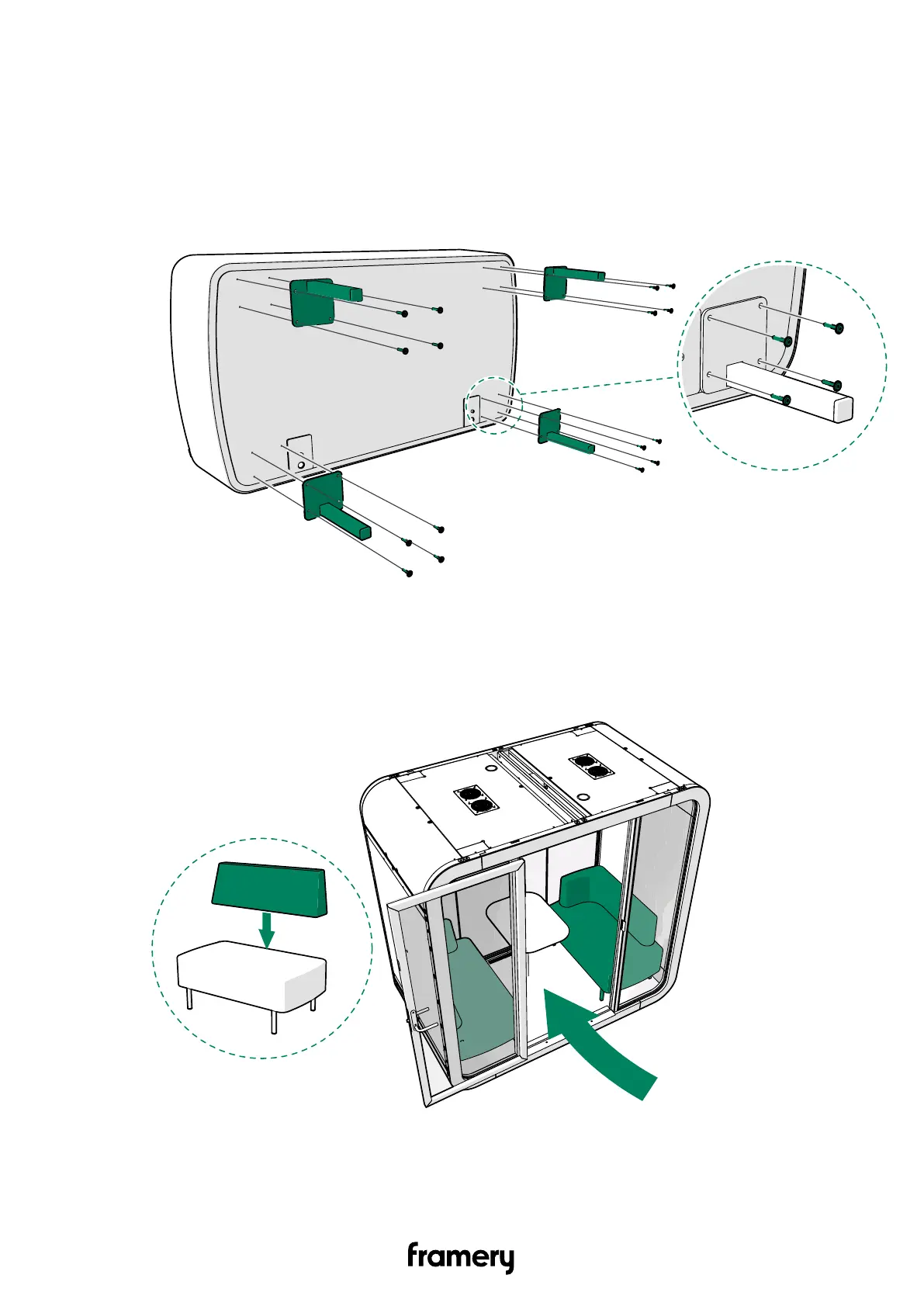 1. Install the seat legs to the bottom of the seat with 4.25x25 wronic screws (4 pcs each).