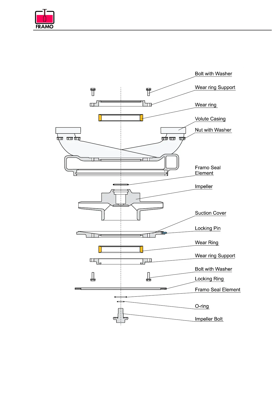 Exploded view of wear rings/impeller/volute casing.
