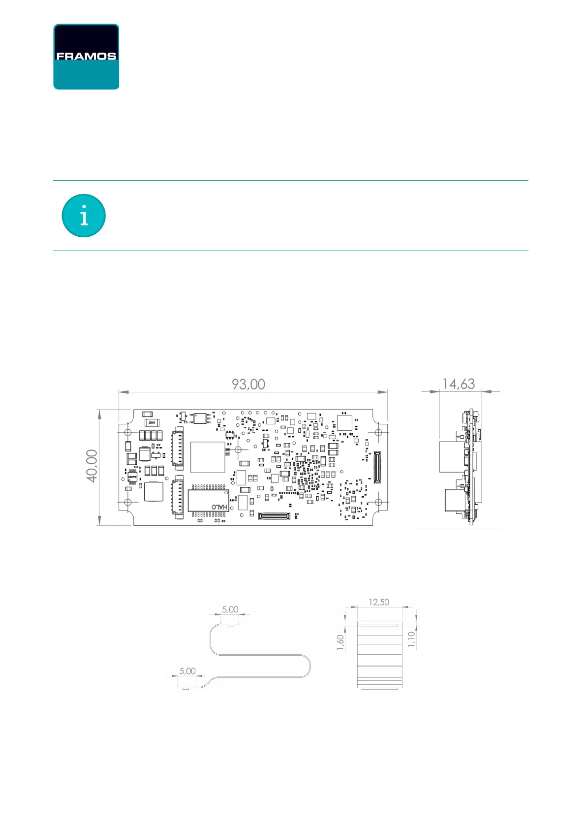 Top and side views and dimensions [mm] for the FRAMOS D4 Visual Processing Board are shown