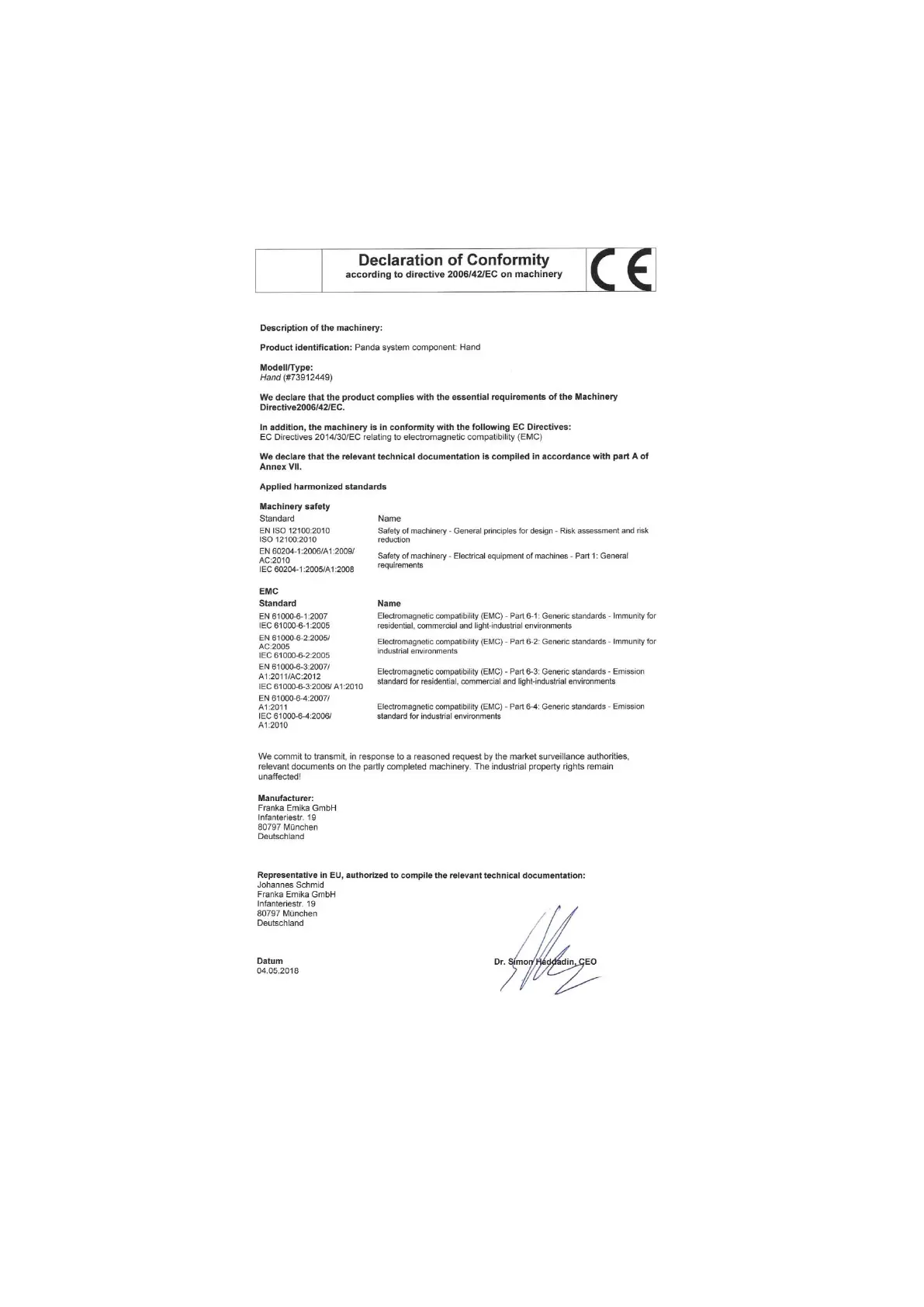Franka Emika HAND - Product Conformity; Declaration of Conformity