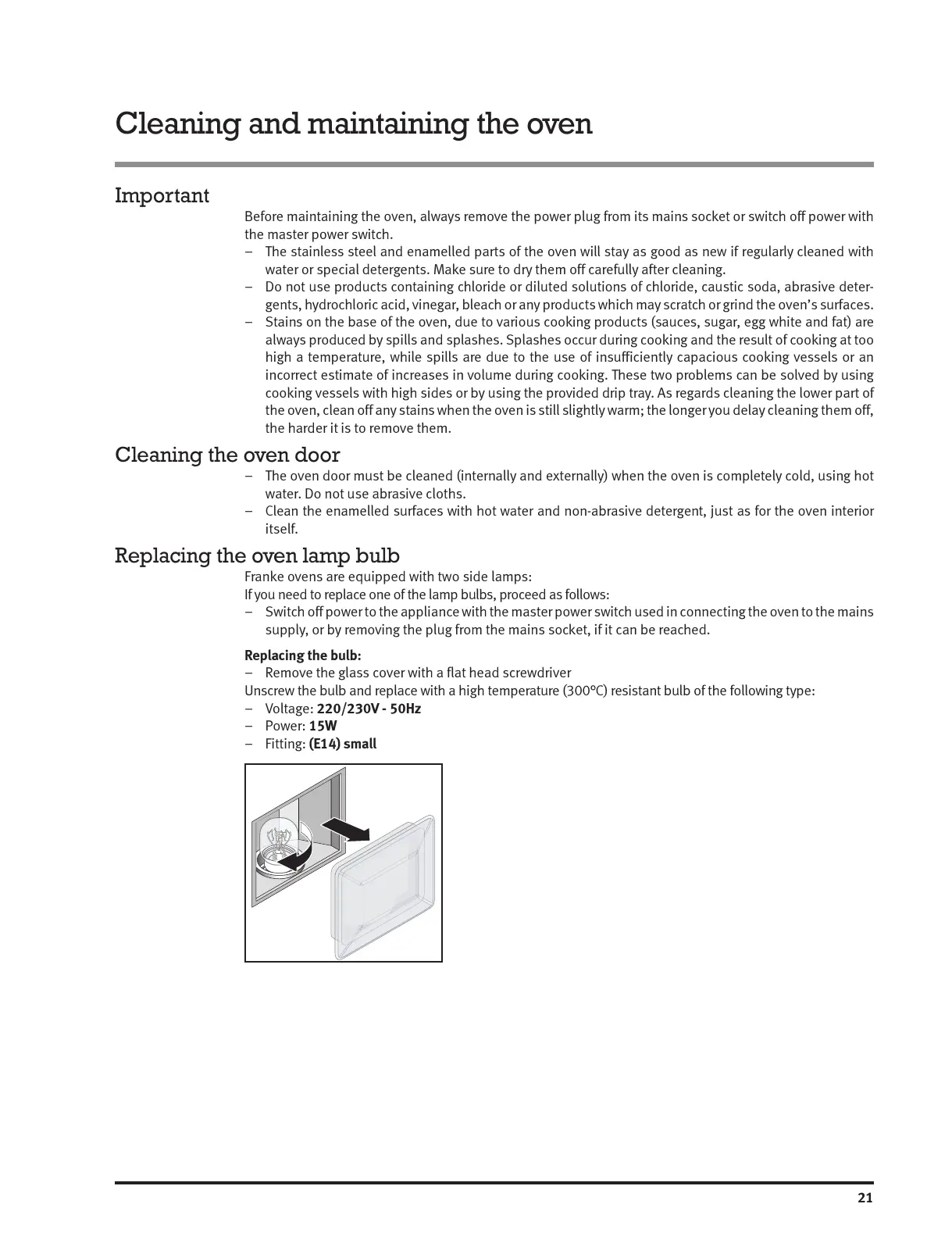 The oven door must be cleaned (internally and externally) when the oven is completely cold, using hot