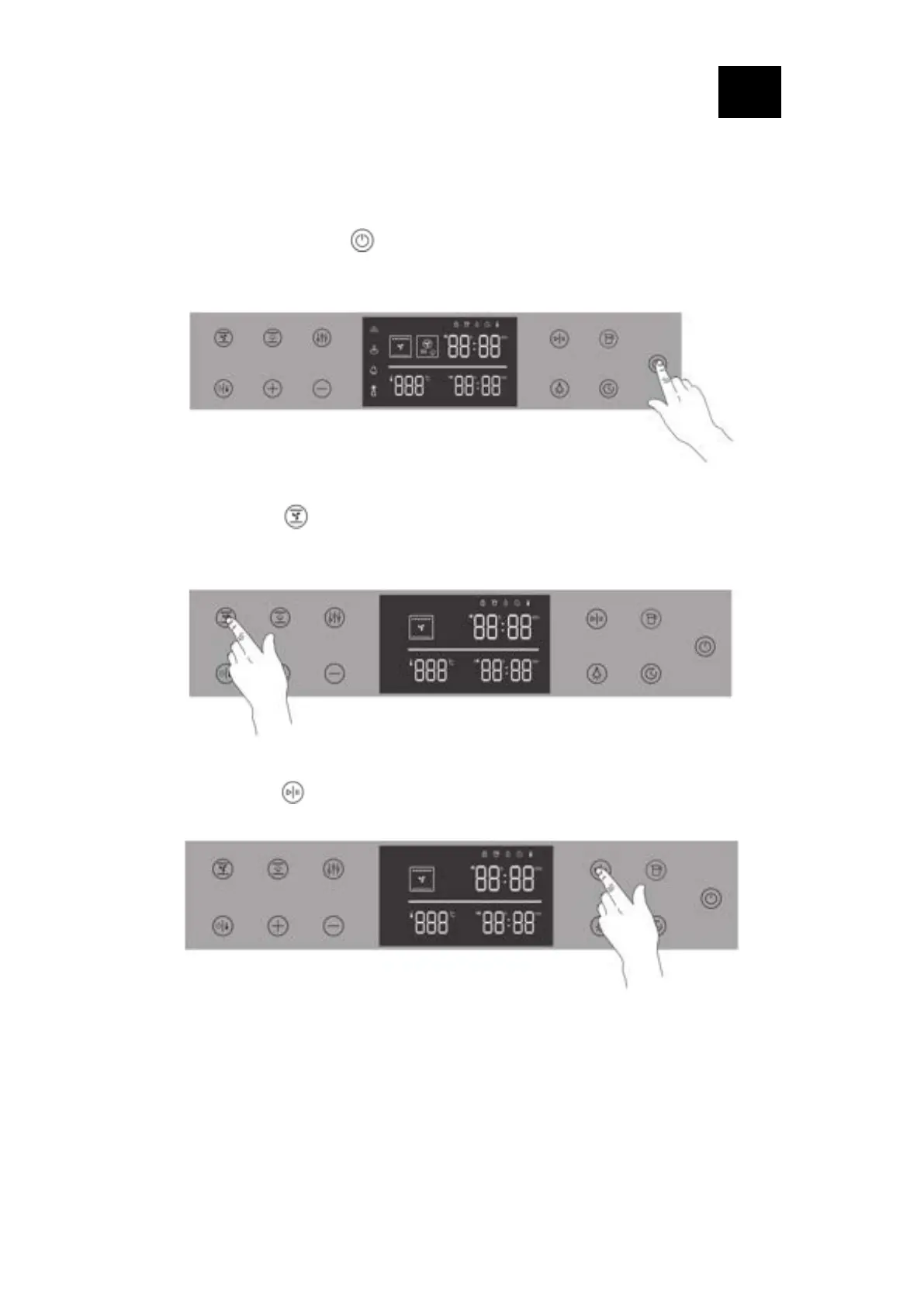 Step 1: Press and hold the “ ” power button for 1.5s, the display is on, and the oven