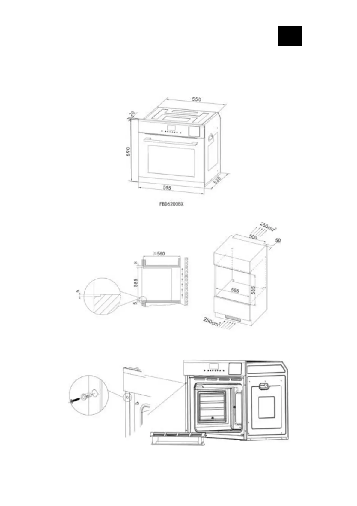 The dimensions of the electrical appliance and the cabinet are in millimeters.