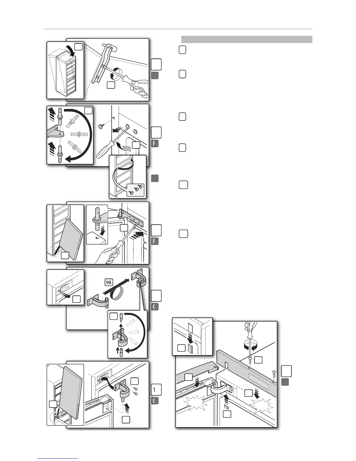 8 A) Fit the freezer door on the pin of the lower hinge.