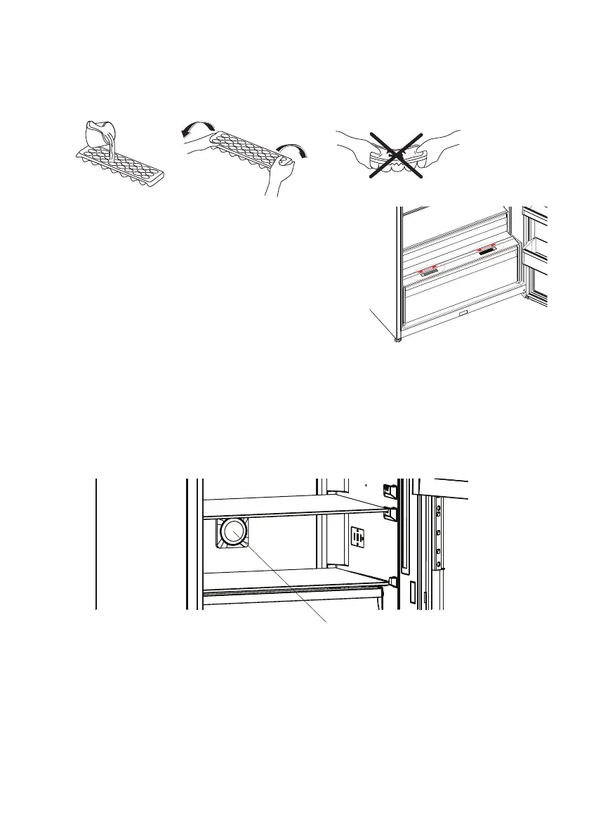 • Die Eiswürfel lösen sich aus der Schale durch Verwinden oder wenn die Eisschale kurze