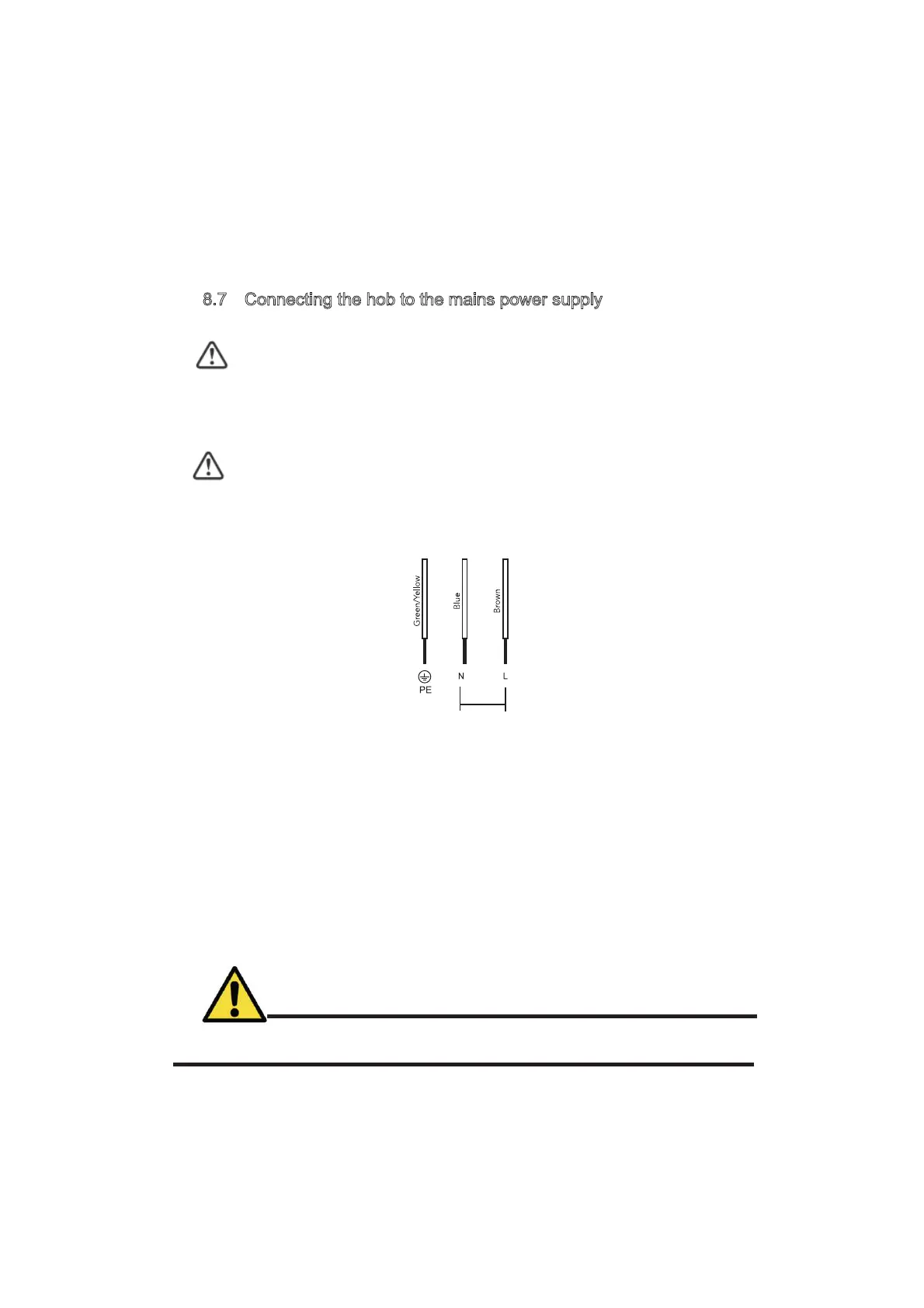 This hob must be connected to the mains power supply only by a suitably qualified person.
