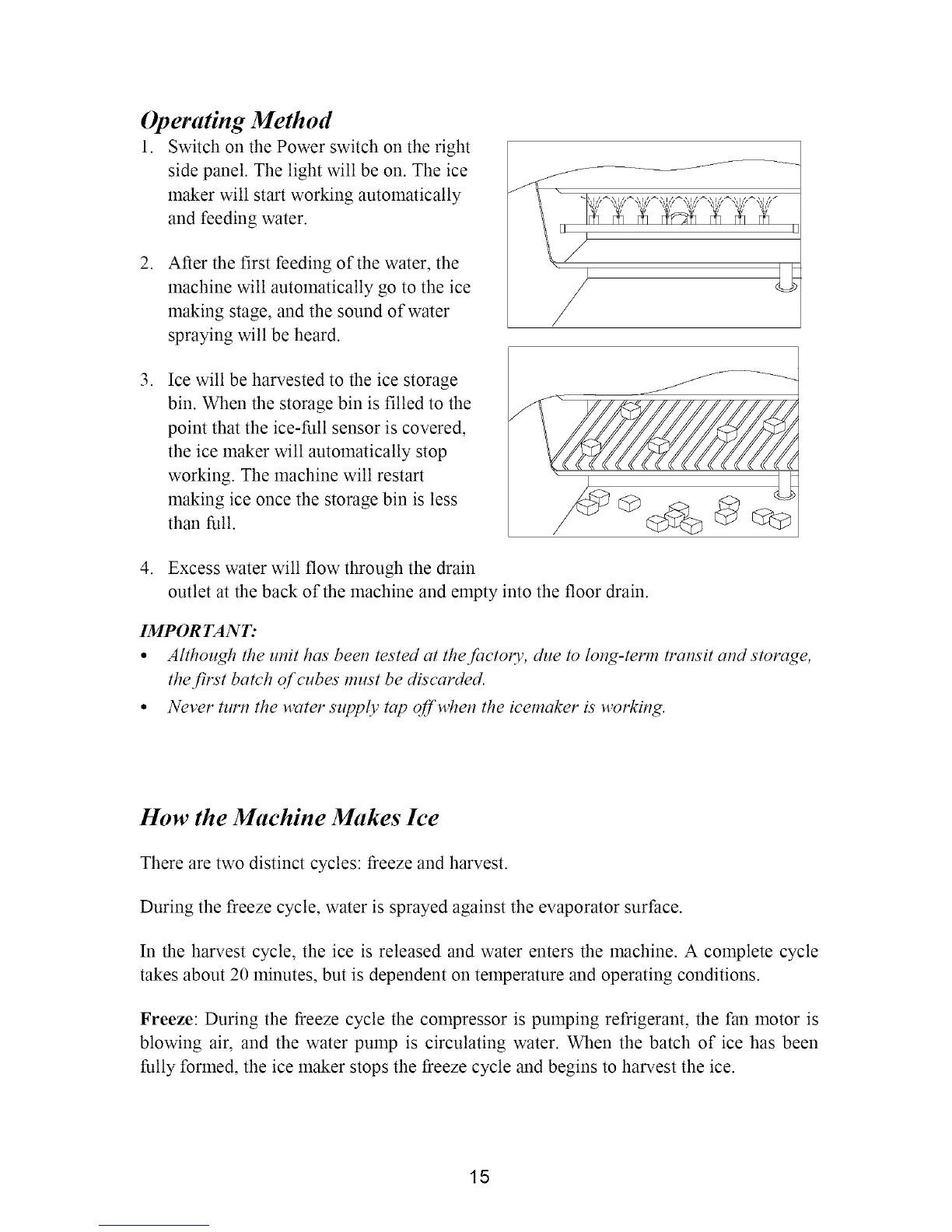 During the freeze cycle, water is sprayed against the evaporator surface.
