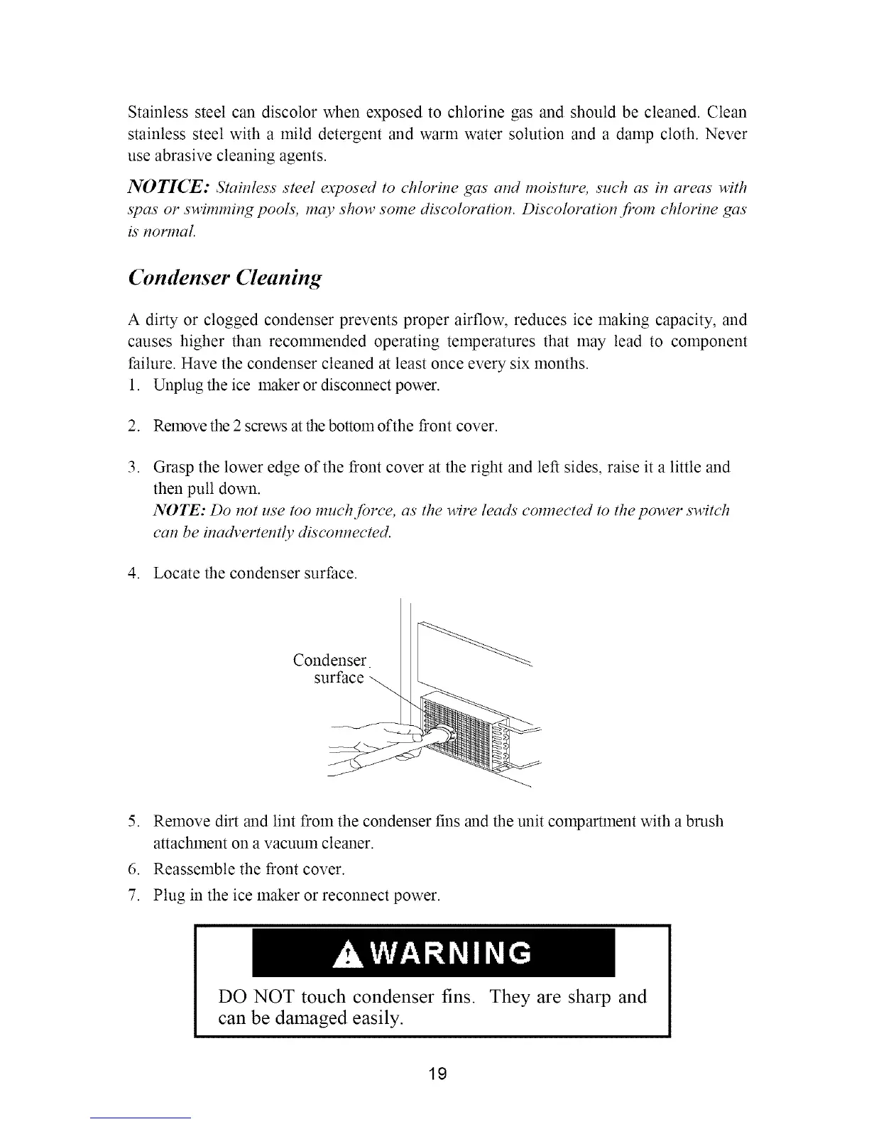DO NOT touch condenser fins. They are sharp and