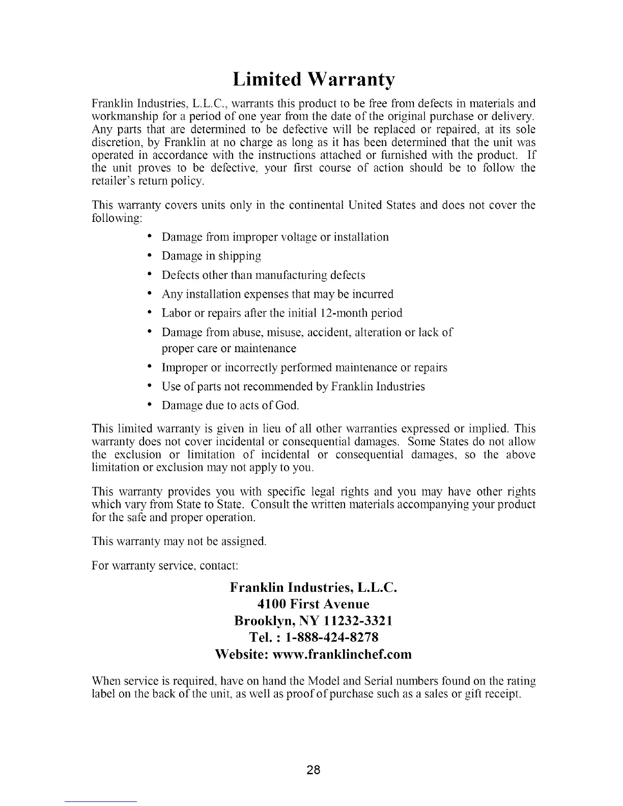 Franklin Industries, L.L.C., warrants this product to be free from defects in materials and