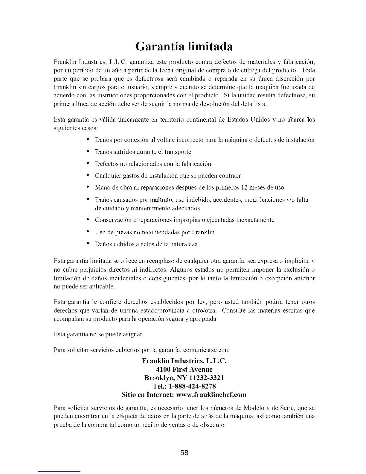Franklin Industries, L.L.C. garantiza este producto contra defectos de materiales y fabricacidn,