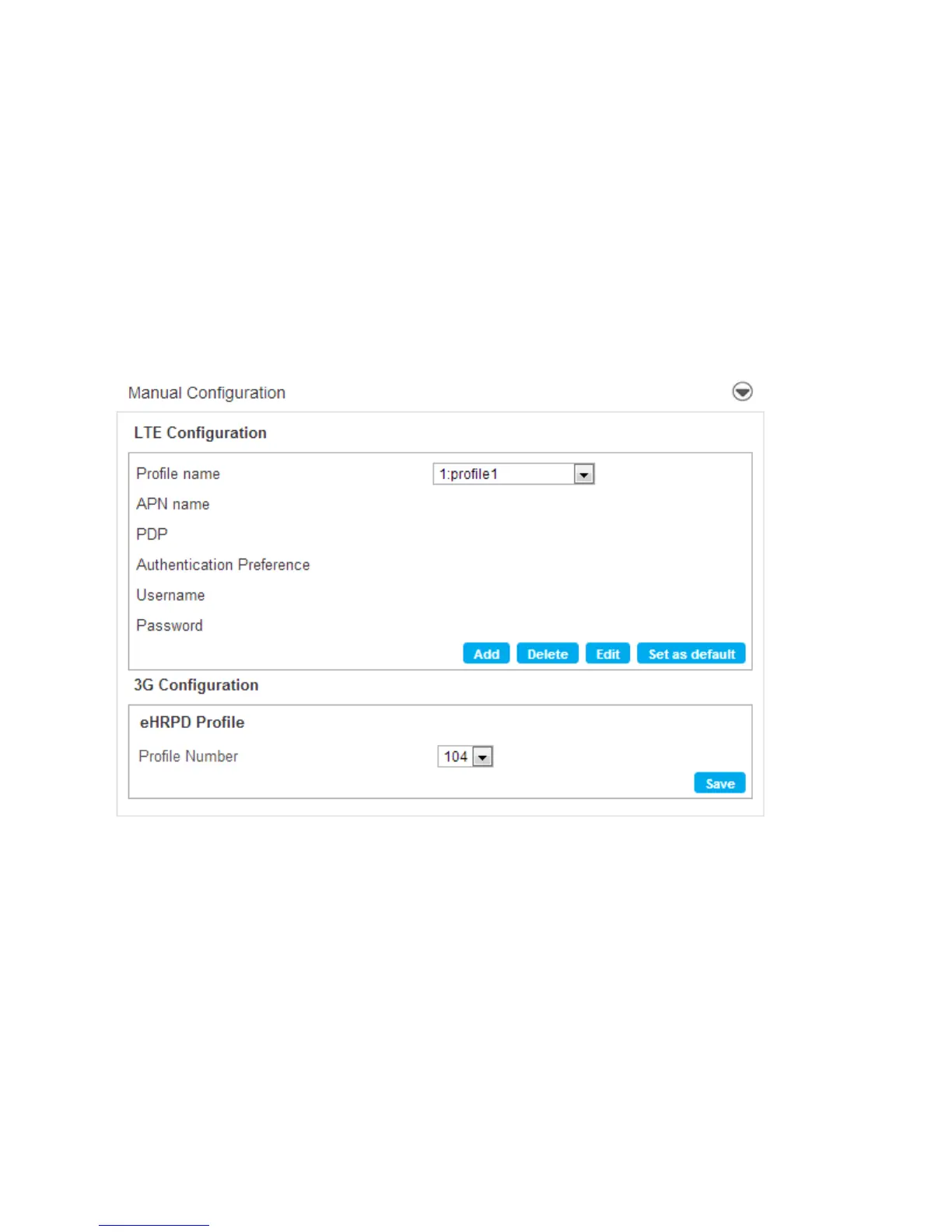 The LTE Configuration box allows you to add, delete and edit the 4G LTE profile.