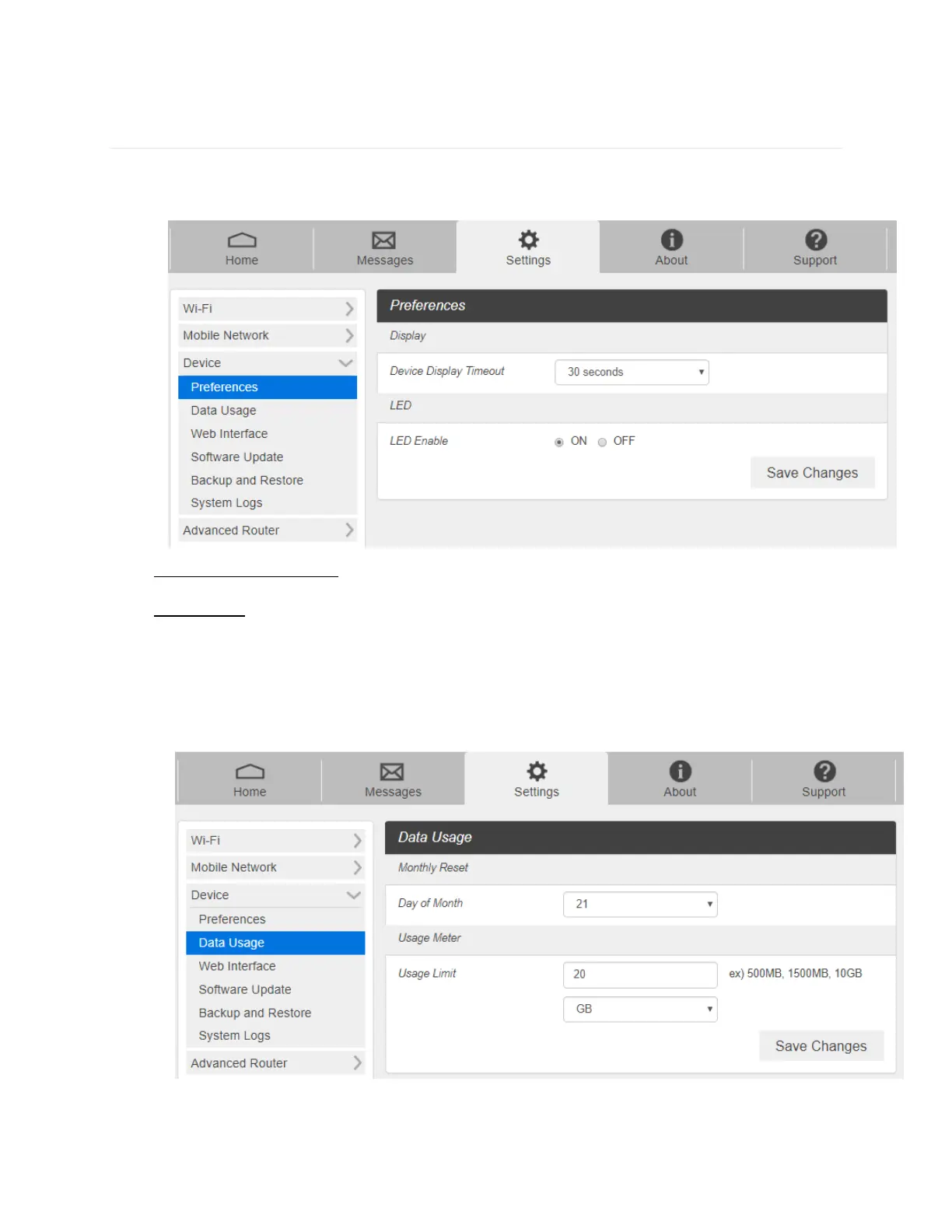 1. From the Web UI, click Settings > Device > Data Usage.