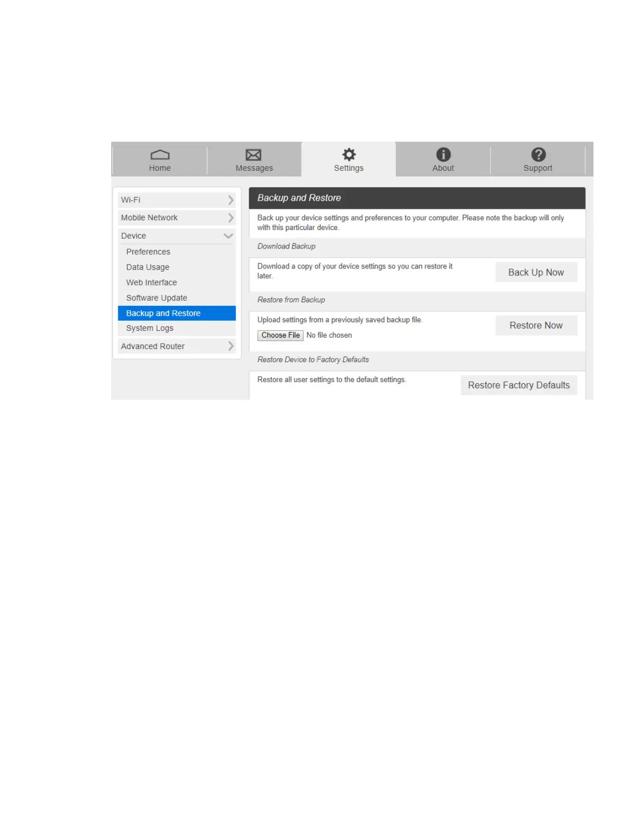 1. From the Web UI, click Settings > Device > Backup and Restore to access menus to