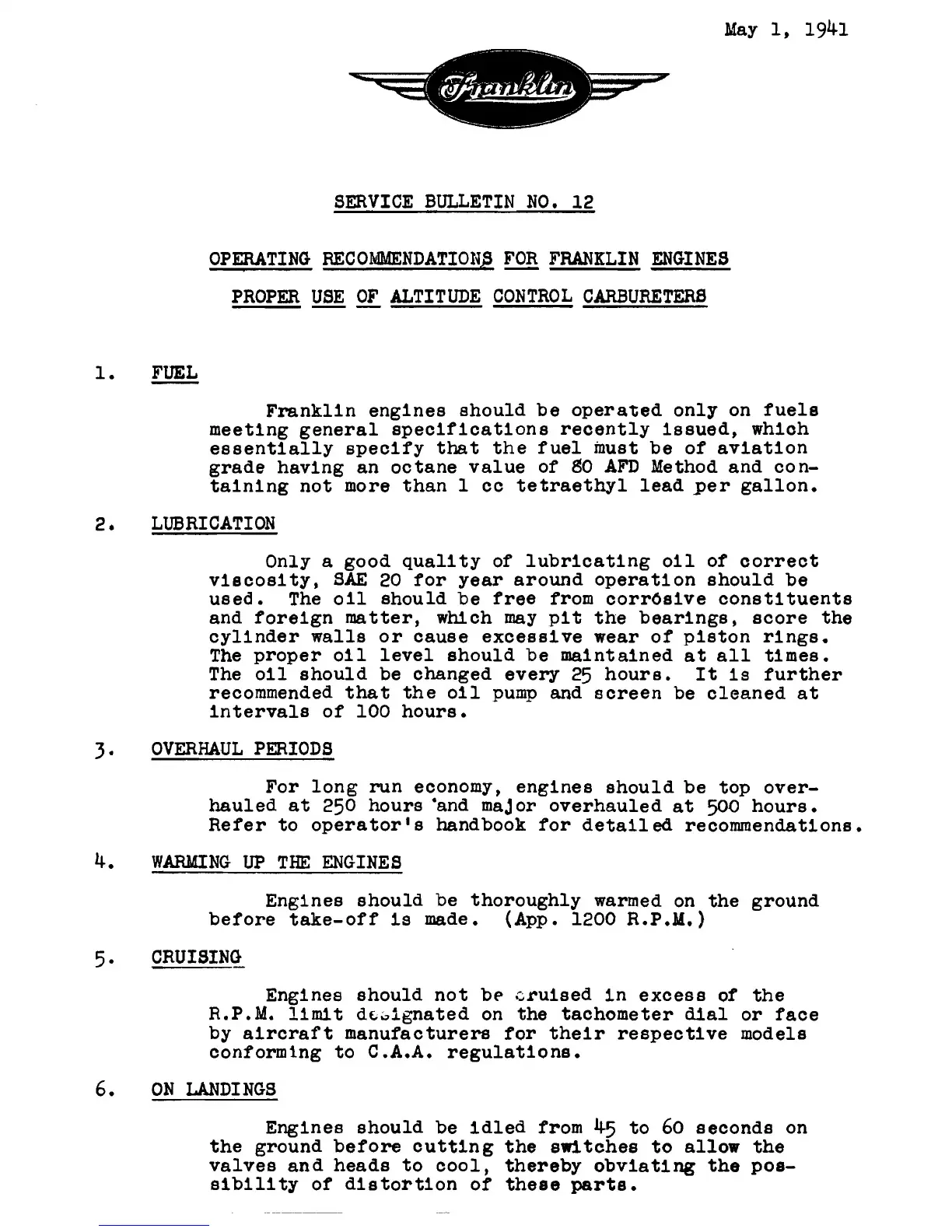 Franklin 4AC-199 - Service Bulletin No. 12: Operating Recommendations; Fuel, Lubrication, and Altitude Control