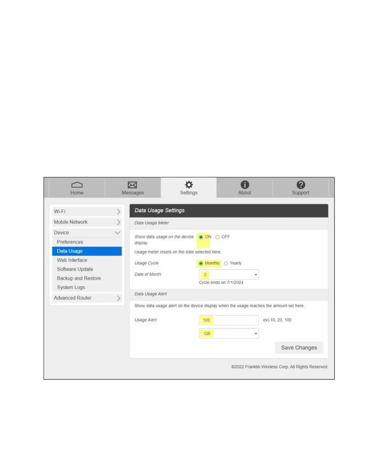 4. In the box labeled Data Usage Alert, update the Usage limit to be “100” and “GB”