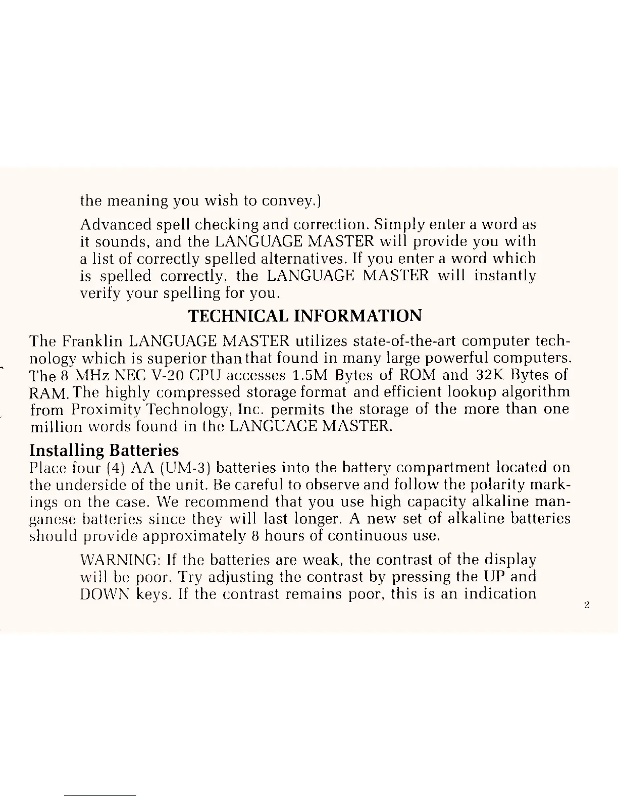 Franklin Language Master LM-2000 - Technical Information; Installing Batteries