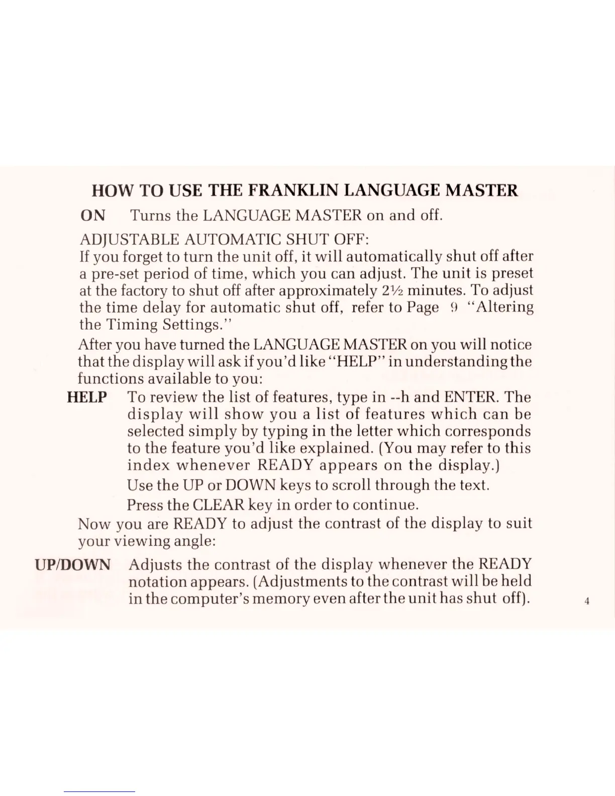 Franklin Language Master LM-2000 - How to Use the Franklin Language Master; On; Adjustable Automatic Shut off; Help