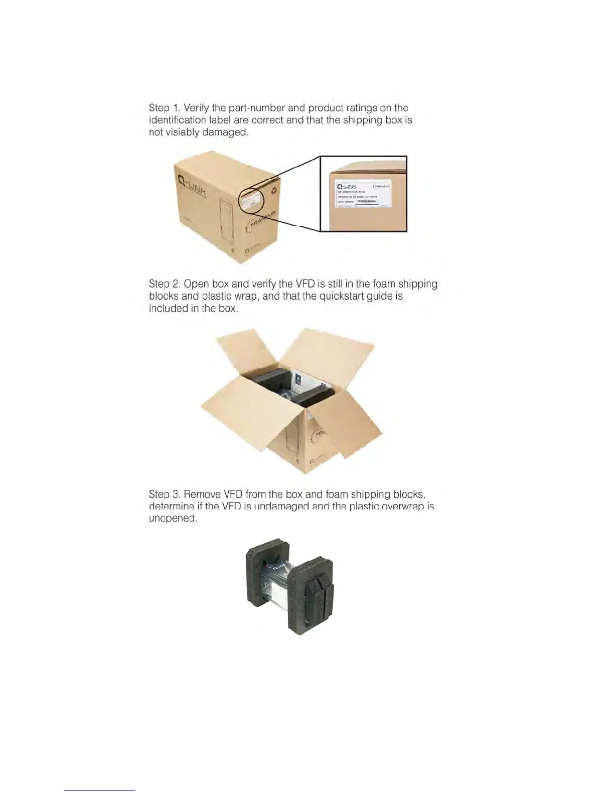 Remove VFD from its packing and inspect its exterior for shipping damage. If there is damage,