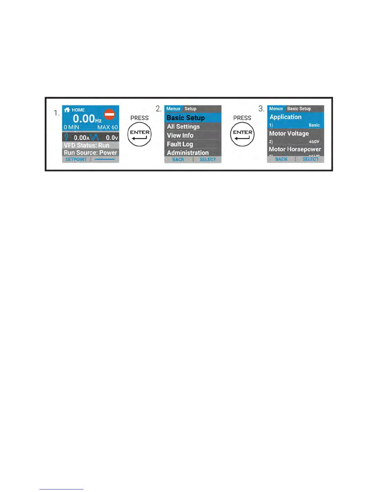 prior to starting the VFD. To access the Basic Parameter group from the Home screen press