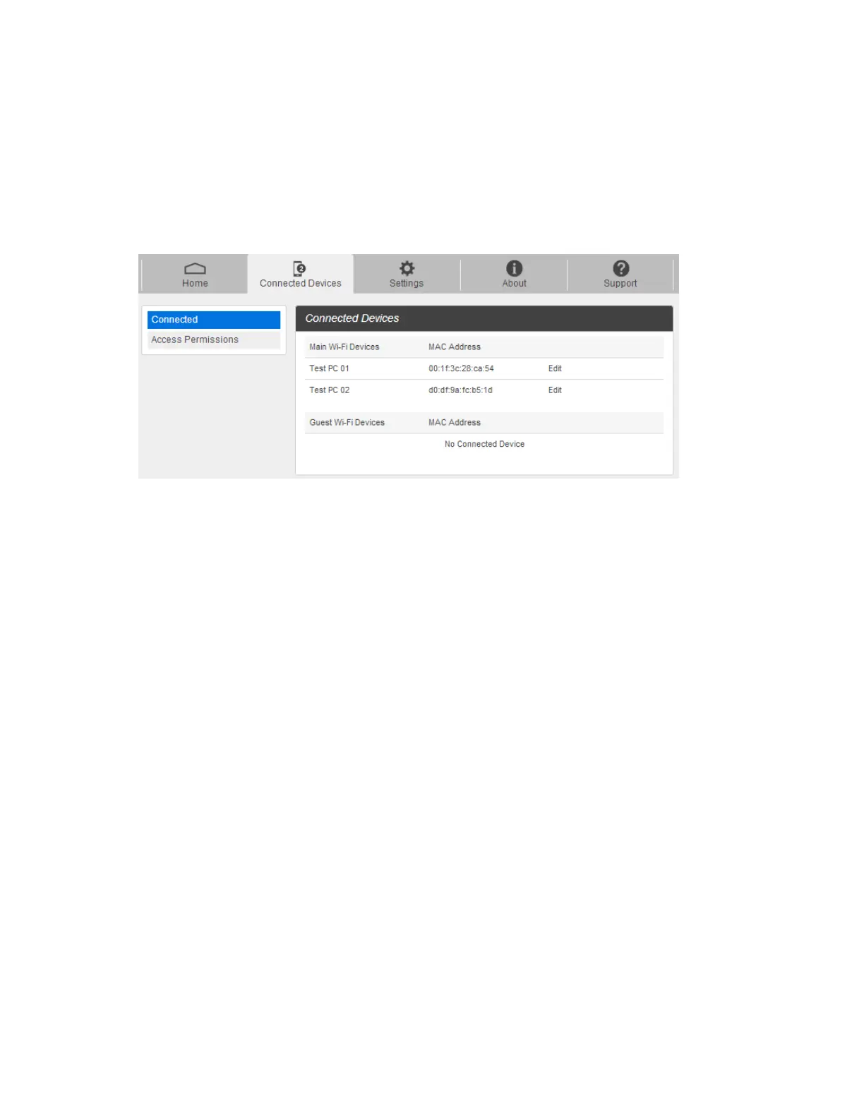 The Connected Devices tab lets you confirm the names and MAC addresses of devices currently connected