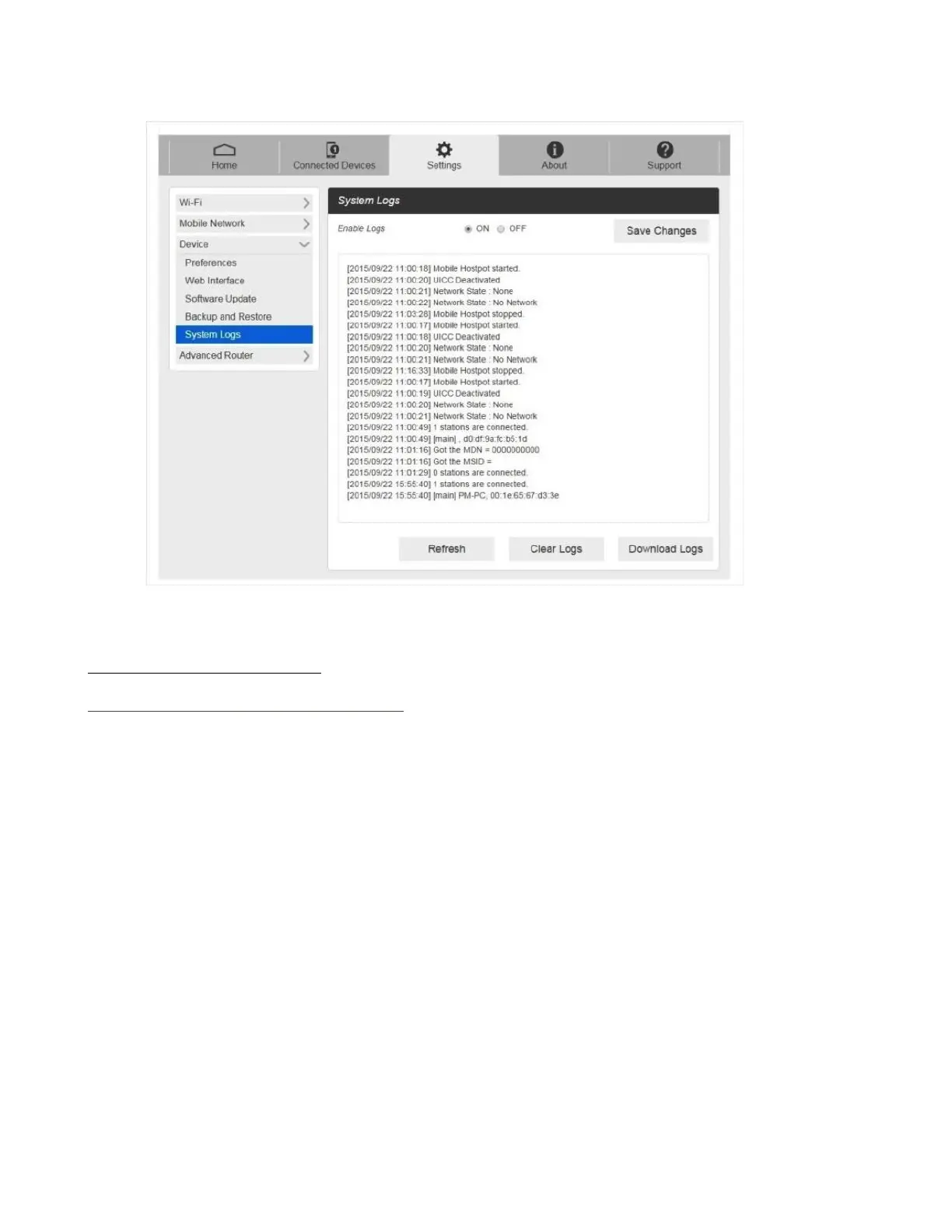 Note: System logs are used for engineering purposes by your service provider. Keep it OFF during
