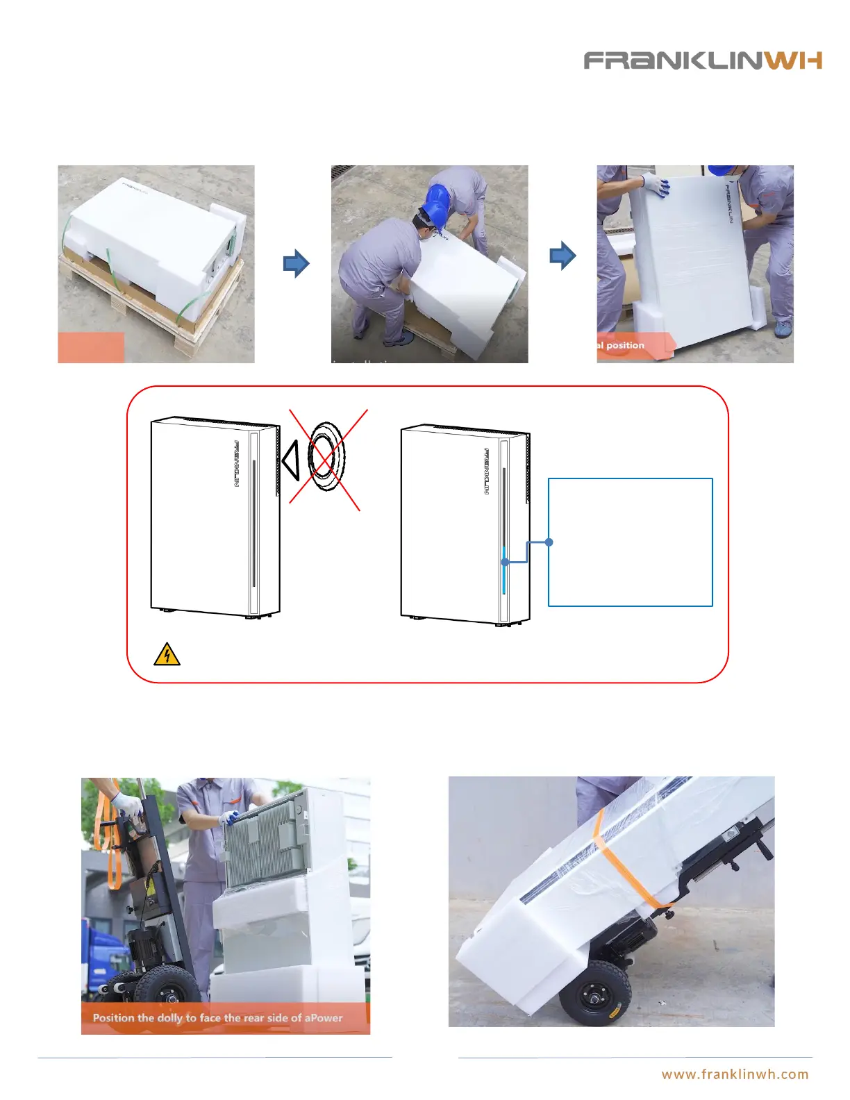 ● Two installers will be needed. Push aPower along the wooden pallet horizontally until the feet of aPower slide off the pallets area