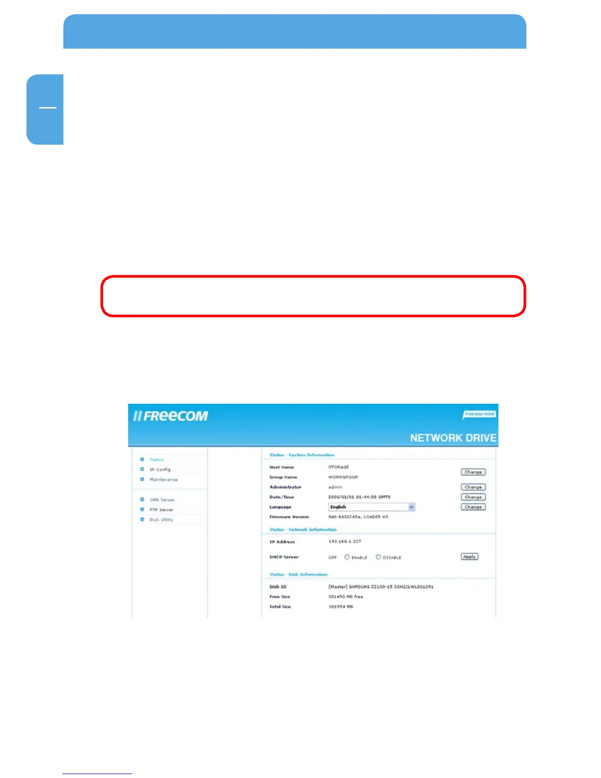 1. Connect the Freecom Network Drive directly to a PC and open the web configura-