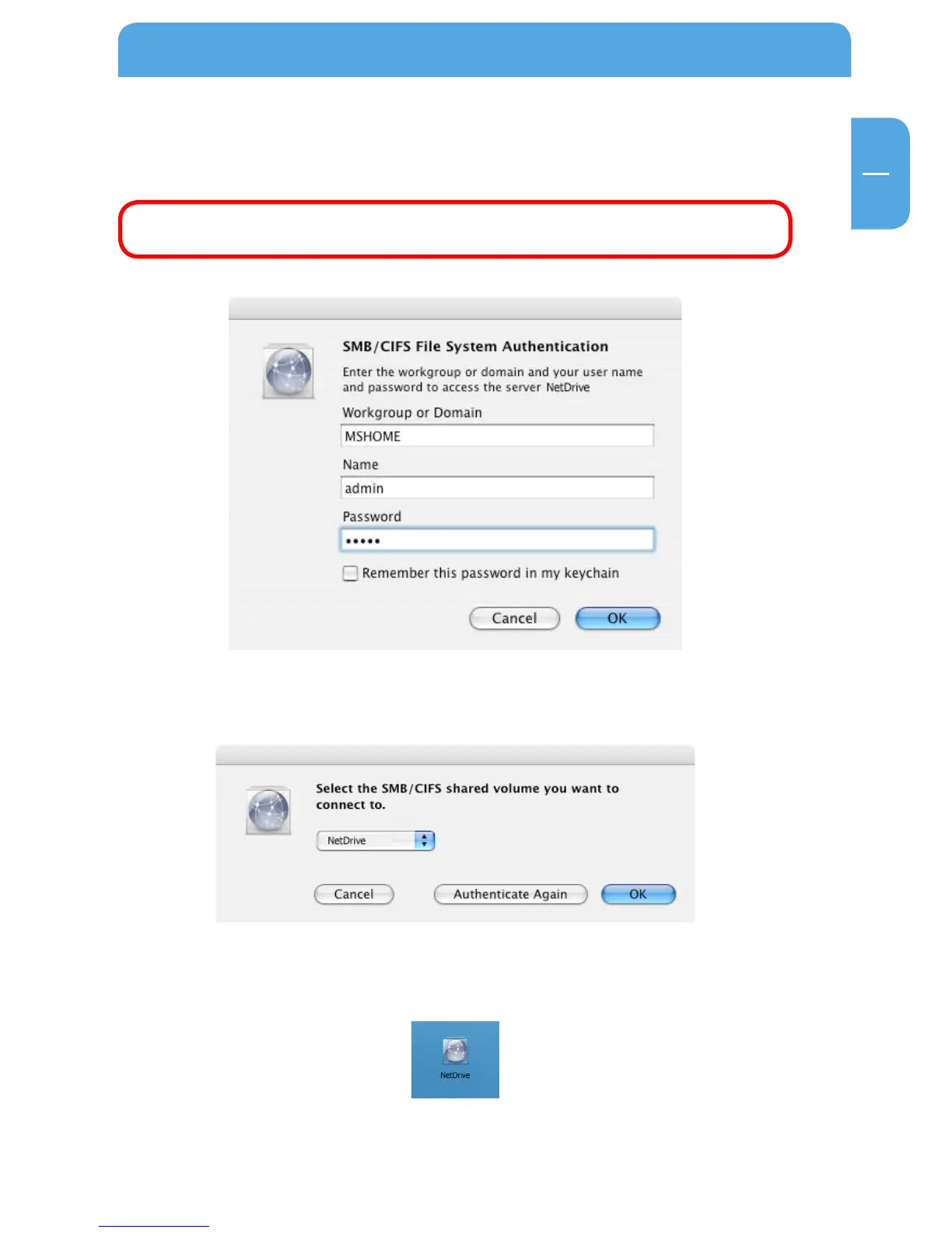 Click 'Connect'. Enter the workgroup, your username and password for accessing the