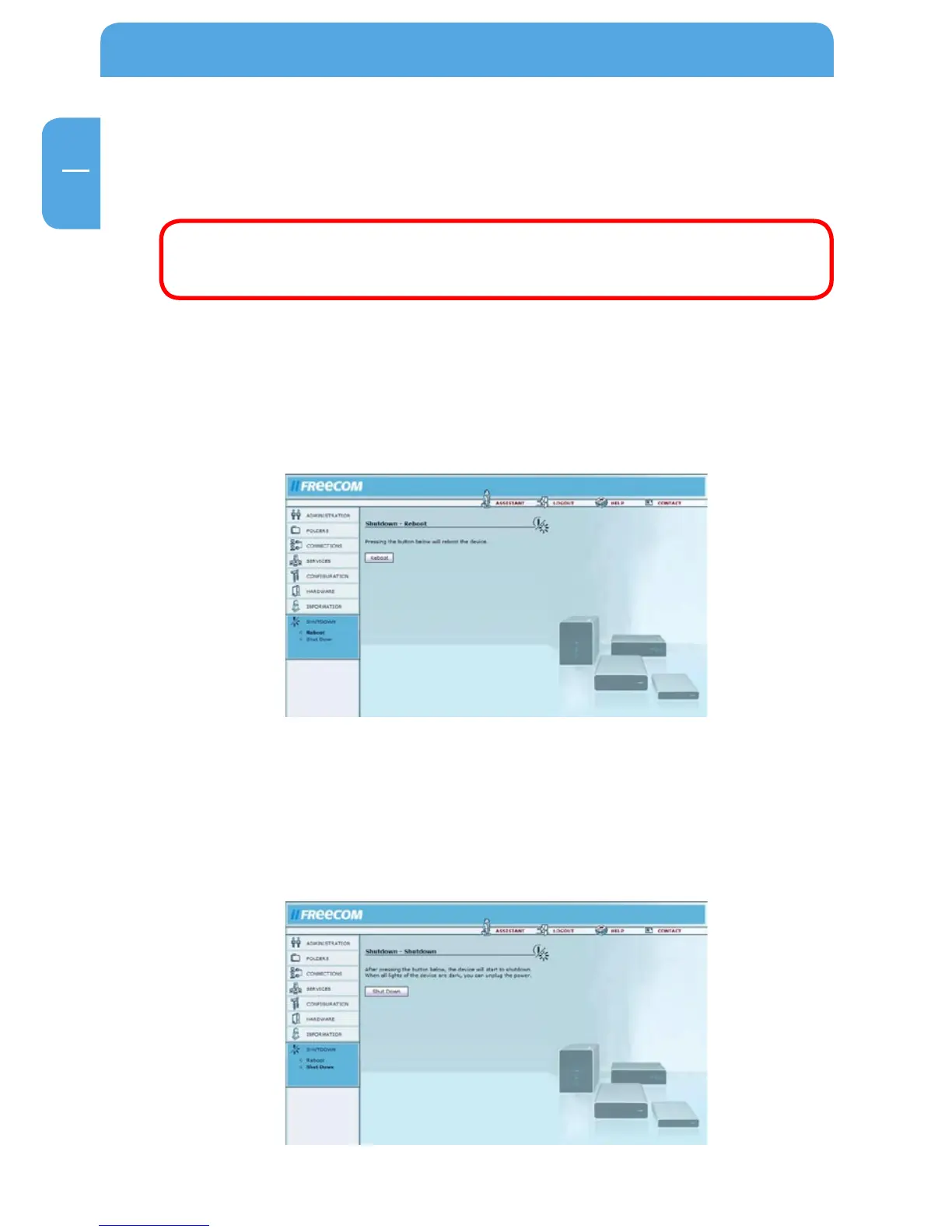 This screen allows you to reboot or shutdown the Network Drive Pro. (You can then safely