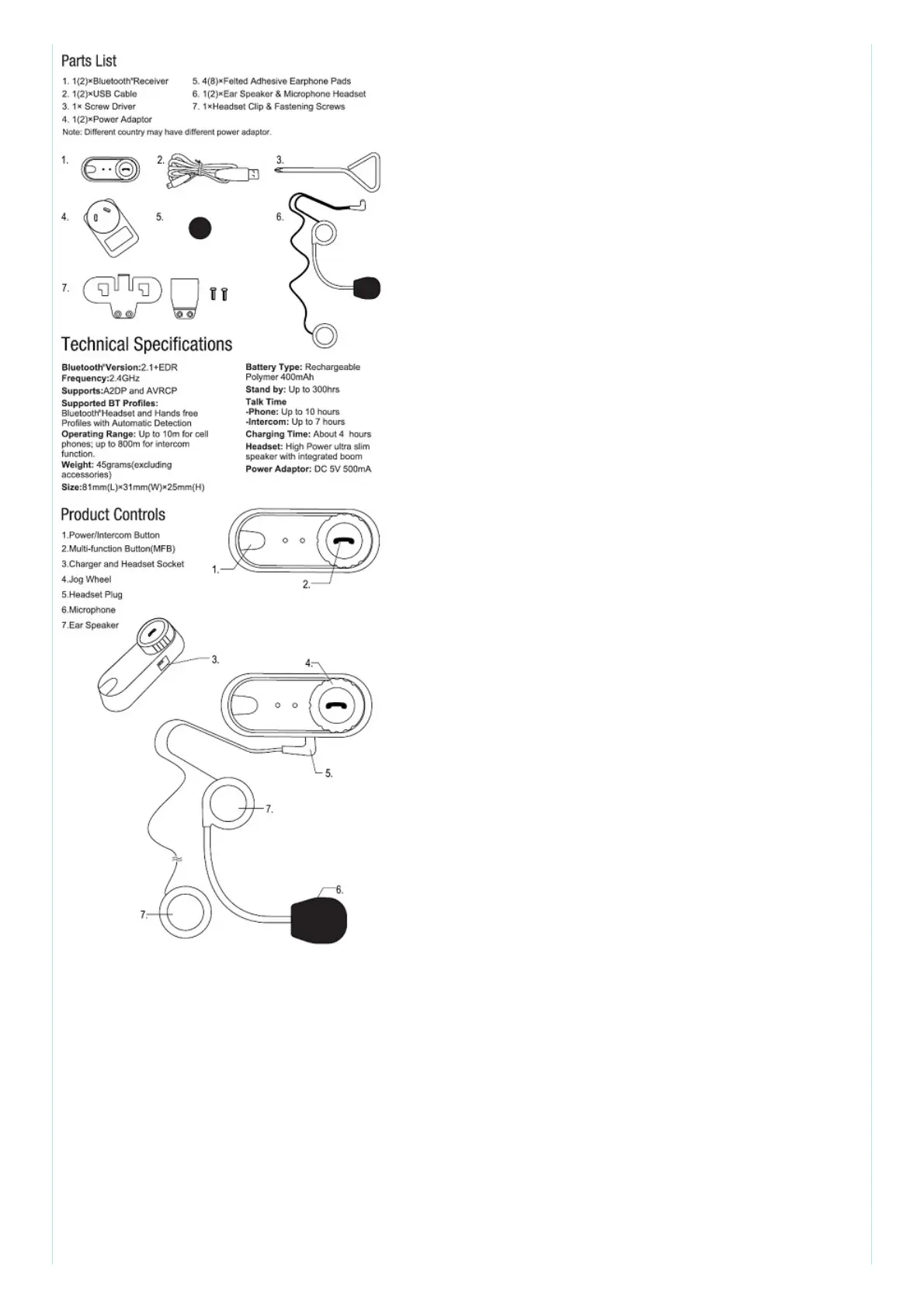FreedConn T-COM - Parts List and Specifications; Parts List; Technical Specifications; Product Controls